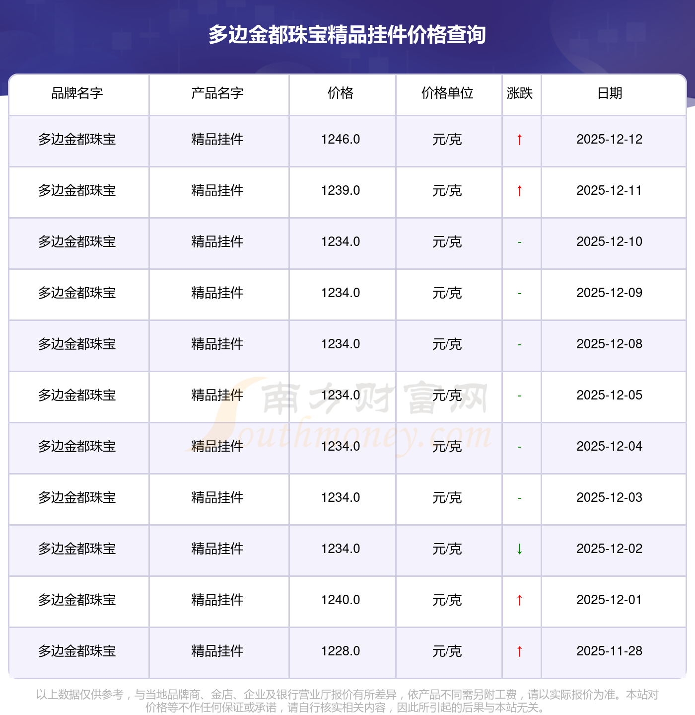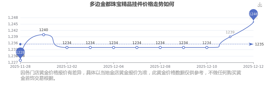 最新数据表明,多边金都珠宝今日 精品挂件价格为1246.0元/克。
