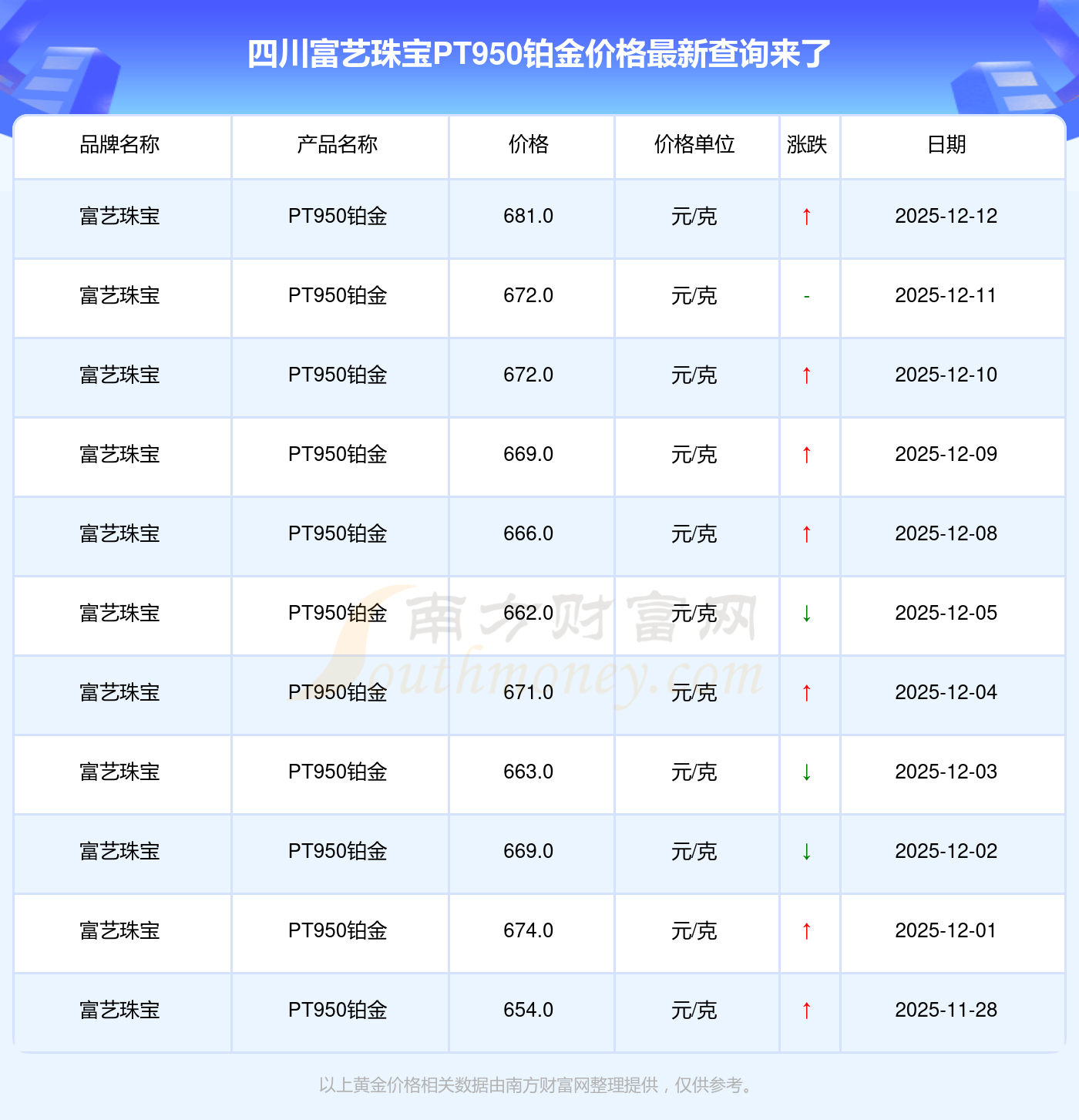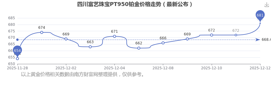 今日(2025年12月13日),四川富艺珠宝PT950铂金的价格是681.0元/克。