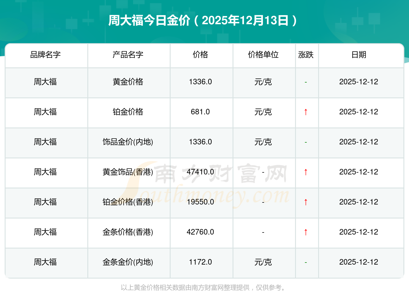 2025年12月13日周大福最新价格:黄金价格1336.0元/克,铂金价格681.0元/克,黄金价格1337.0元/克,铂金价格650.0元/克,黄金价格1339.0元/克,铂金价格600.0元/克,黄金价格1338.0元/克,铂金价格681.0元/克,饰品金价(内地)1336.0元/克,黄金饰品(香港)47410.0,铂金价格(香港)19550.0。