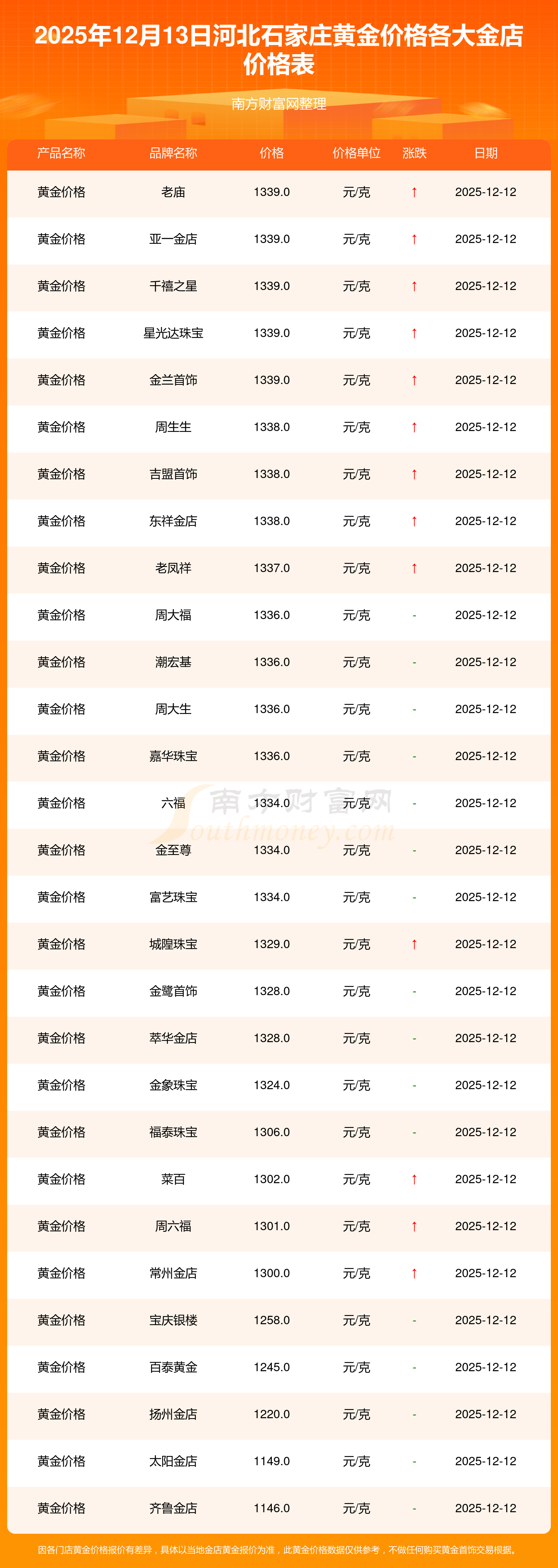 2025年12月13日,河北石家庄周大福、周大福、老凤祥、老凤祥、老庙、老庙、周生生、周生生、周大福、周大福、周大福等各大金店品牌黄金价格今日价格如下:周大福1336.0元/克、周大福681.0元/克、老凤祥1337.0元/克、老凤祥650.0元/克、老庙1339.0元/克、老庙600.0元/克、周生生1338.0元/克、周生生681.0元/克、周大福1336.0元/克、周大福47410.0、周大福19550.0。