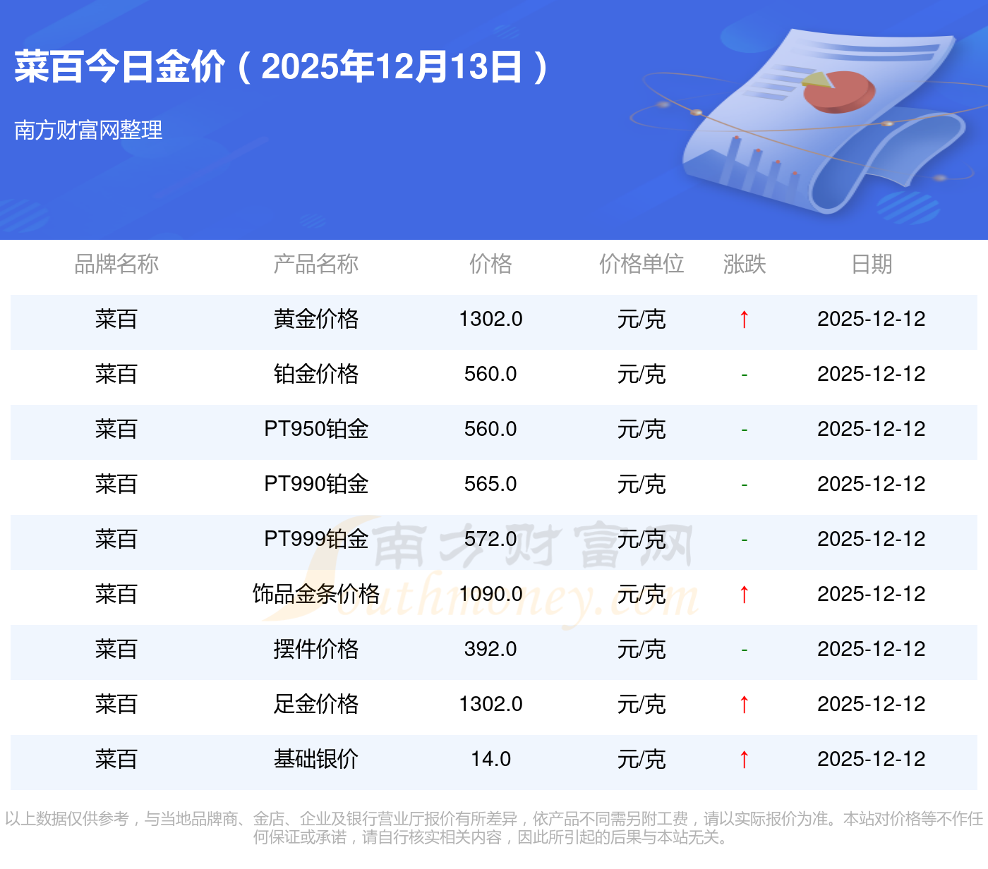 2025年12月13日菜百金价查询:黄金价格1336.0元/克,铂金价格681.0元/克,黄金价格1337.0元/克,铂金价格650.0元/克,黄金价格1339.0元/克,铂金价格600.0元/克,黄金价格1338.0元/克,铂金价格681.0元/克,饰品金价(内地)1336.0元/克,黄金饰品(香港)47410.0,铂金价格(香港)19550.0。