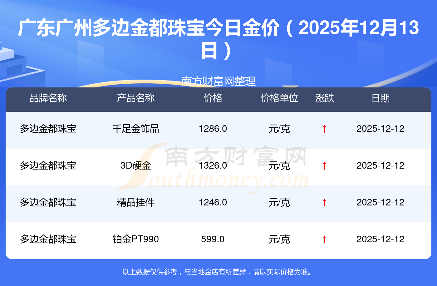 2025年12月13日广东广州多边金都珠宝金价查询:黄金价格1336.0元/克,铂金价格681.0元/克,黄金价格1337.0元/克,铂金价格650.0元/克,黄金价格1339.0元/克,铂金价格600.0元/克,黄金价格1338.0元/克,铂金价格681.0元/克,饰品金价(内地)1336.0元/克,黄金饰品(香港)47410.0,铂金价格(香港)19550.0。
