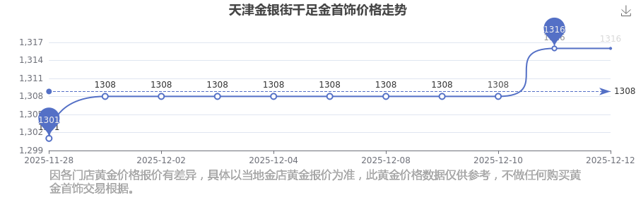 2025年12月13日,天津金银街千足金首饰每克的售卖价位为1316.0元/克。