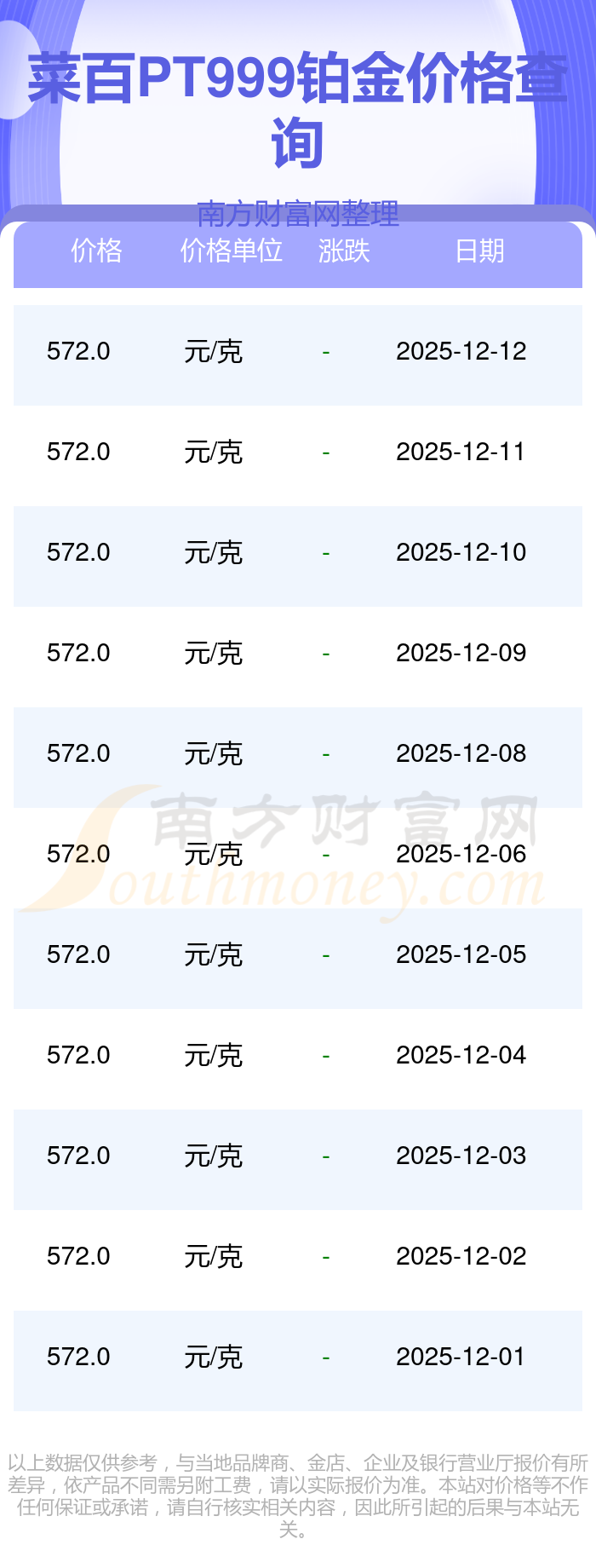2025年12月13日菜百PT999铂金价格是572.0元/克。