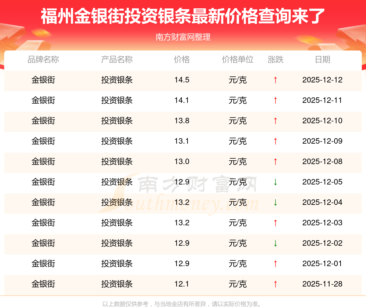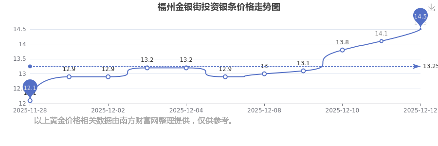 今日(2025年12月13日)福州金银街投资银条最新价格为14.5元/克。