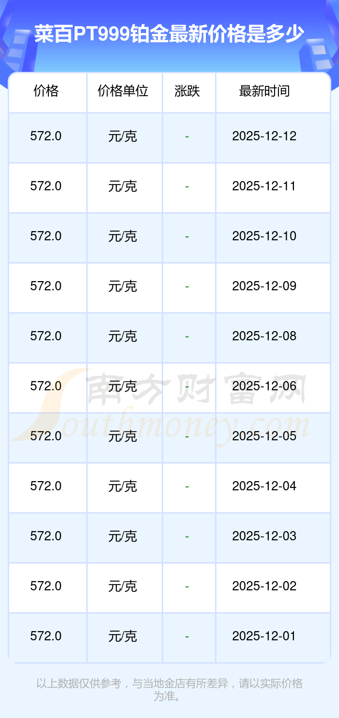 572.0元/克是菜百在今日给出的 PT999铂金最新价格。