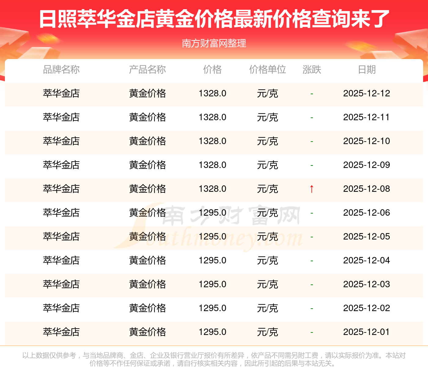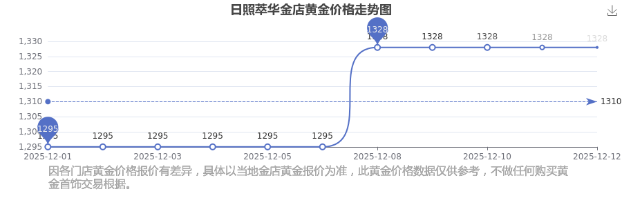 今日日照萃华金店黄金价格的价格为1328.0元/克。