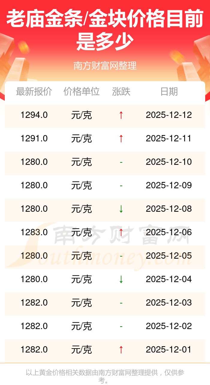 今日老庙 金条/金块价格的最新定价为1294.0元/克。