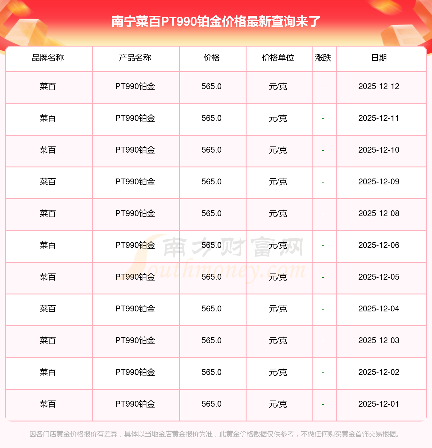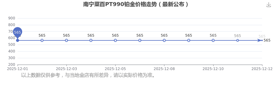 今日(2025年12月13日)南宁菜百PT990铂金价格为565.0元/克。