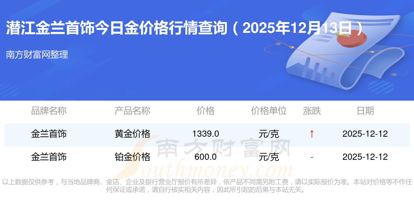 今日黄金价格查询_现在金价黄金一克多少钱,黄金价格是多少钱一克?2025年12月13日潜江金兰首饰最新价格:黄金价格1336.0元/克,铂金价格681.0元/克,黄金价格1337.0元/克,铂金价格650.0元/克,黄金价格1339.0元/克,铂金价格600.0元/克,黄金价格1338.0元/克,铂金价格681.0元/克,饰品金价(内地)1336.0元/克,黄金饰品(香港)47410.0,铂金价格(香港)19550.0。