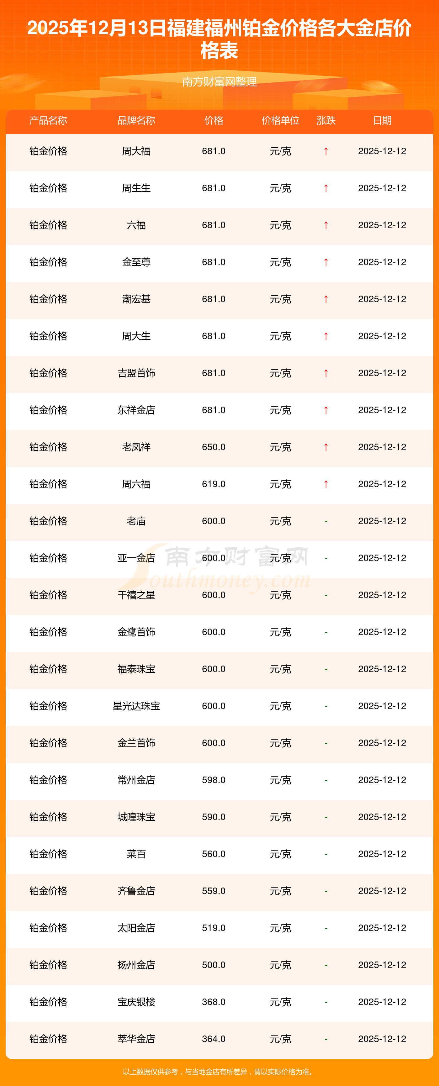 今天是2025年12月13日,福建福州周大福、周大福、老凤祥、老凤祥、老庙、老庙、周生生、周生生、周大福、周大福、周大福等各大金店品牌铂金价格最新价格如下:周大福1336.0元/克、周大福681.0元/克、老凤祥1337.0元/克、老凤祥650.0元/克、老庙1339.0元/克、老庙600.0元/克、周生生1338.0元/克、周生生681.0元/克、周大福1336.0元/克、周大福47410.0、周大福19550.0。