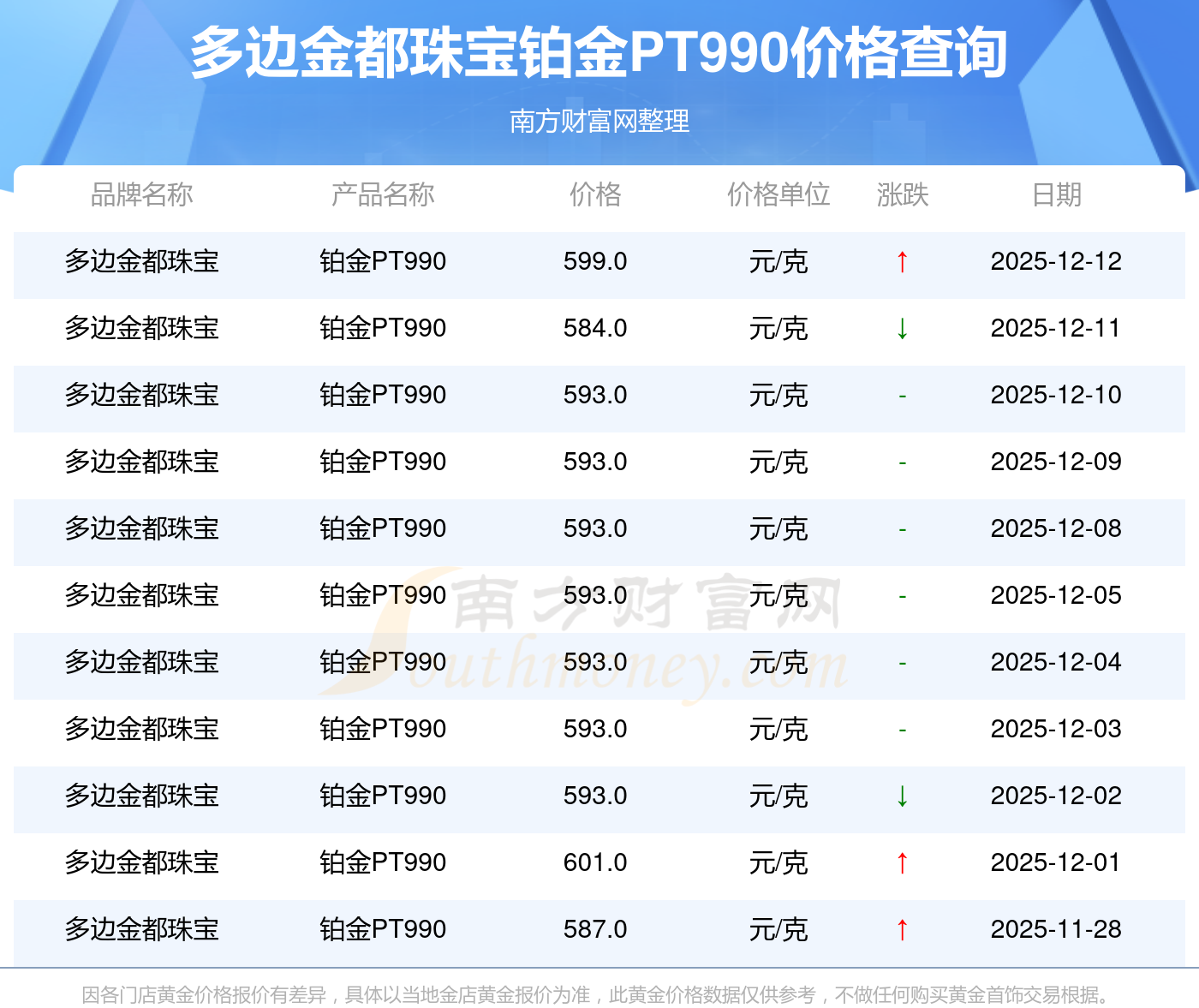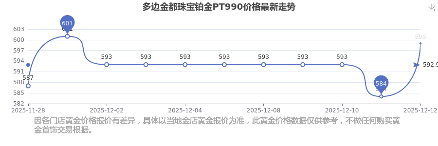 今日多边金都珠宝铂金PT990的价格是599.0元/克。