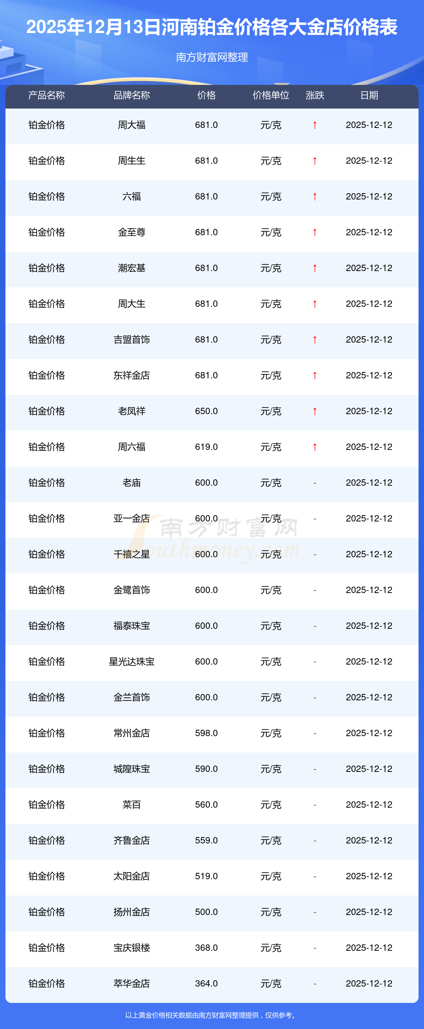 2025年12月13日河南各大金店铂金价格最新价格查询来了:周大福1336.0元/克,周大福681.0元/克,老凤祥1337.0元/克,老凤祥650.0元/克,老庙1339.0元/克,老庙600.0元/克,周生生1338.0元/克,周生生681.0元/克,周大福1336.0元/克,周大福47410.0,周大福19550.0。