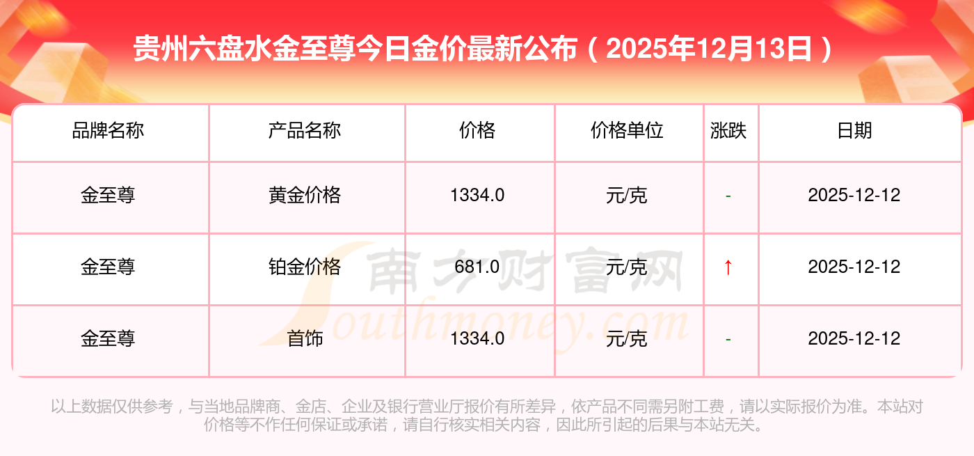 想查询今日黄金价格,当下黄金一克具体售价几何?2025年12月13日贵州六盘水金至尊黄金的单价,一克为多少?黄金价格1336.0元/克,铂金价格681.0元/克,黄金价格1337.0元/克,铂金价格650.0元/克,黄金价格1339.0元/克,铂金价格600.0元/克,黄金价格1338.0元/克,铂金价格681.0元/克,饰品金价(内地)1336.0元/克,黄金饰品(香港)47410.0,铂金价格(香港)19550.0。