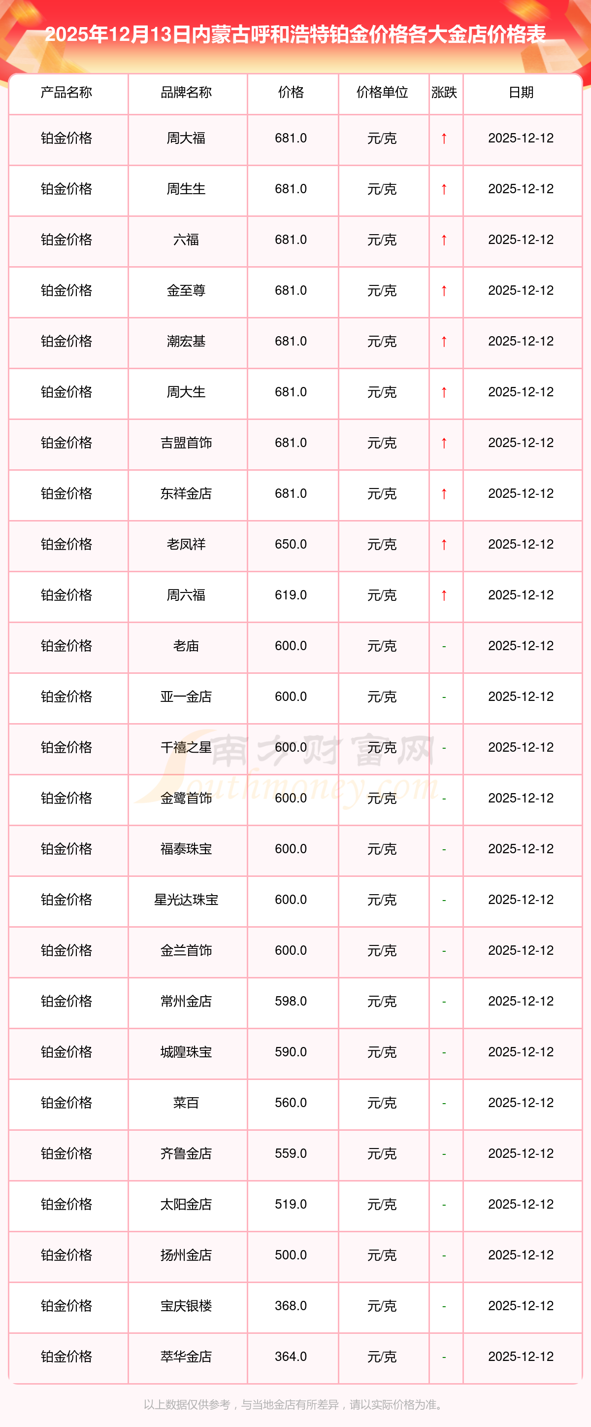 2025年12月13日内蒙古呼和浩特周大福、周大福、老凤祥、老凤祥、老庙、老庙、周生生、周生生、周大福、周大福、周大福等各大金店品牌铂金价格最新价格如下:周大福黄金价格1336.0元/克,周大福铂金价格681.0元/克,老凤祥黄金价格1337.0元/克,老凤祥铂金价格650.0元/克,老庙黄金价格1339.0元/克,老庙铂金价格600.0元/克,周生生黄金价格1338.0元/克,周生生铂金价格681.0元/克,周大福饰品金价(内地)1336.0元/克,周大福黄金饰品(香港)47410.0,周大福铂金价格(香港)19550.0。
