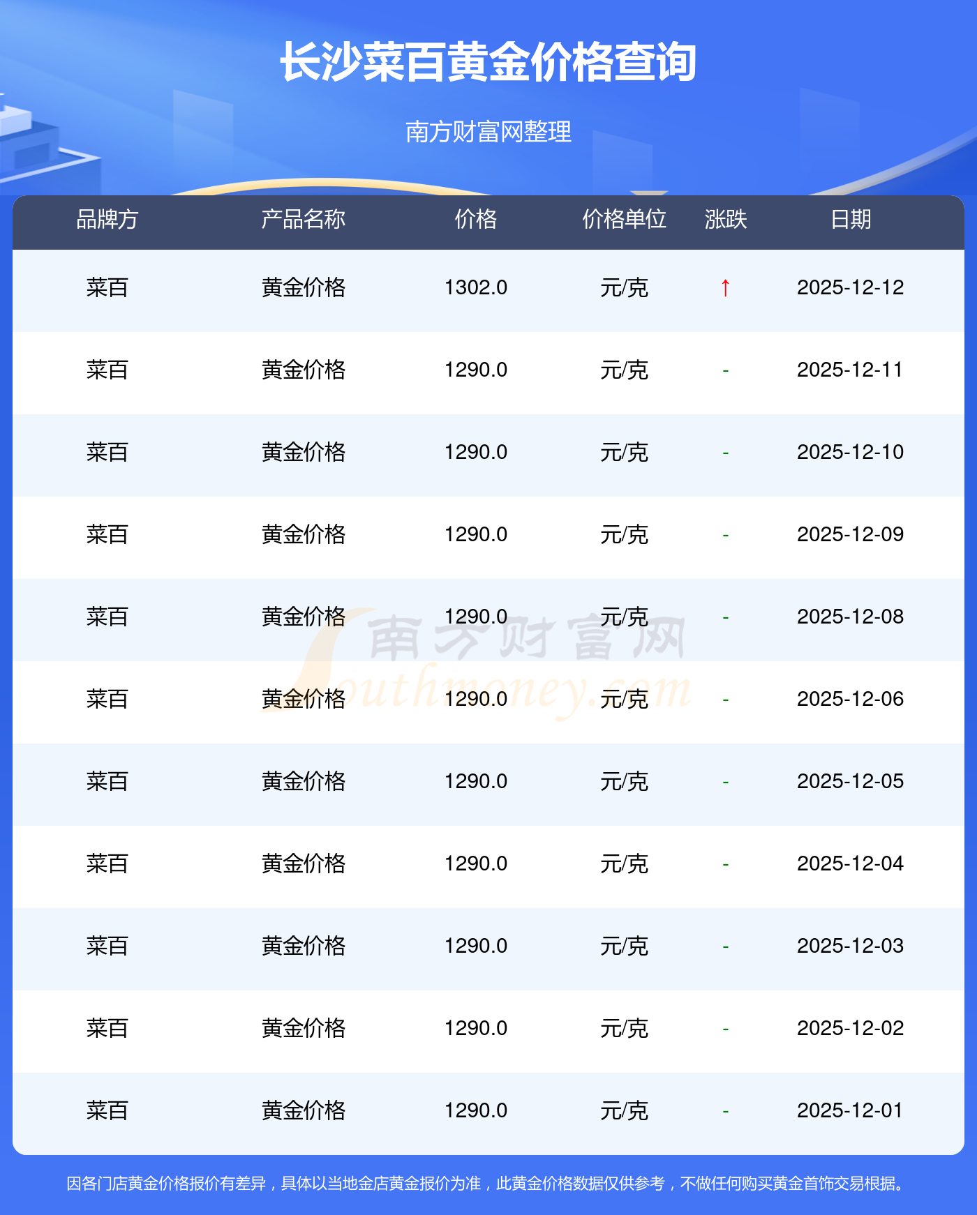 1302.0元/克,这是长沙菜百于 2025年12月13日所定的黄金价格。