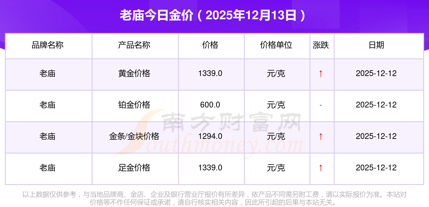 今天是2025年12月13日,周大福、周大福、老凤祥、老凤祥、老庙、老庙、周生生、周生生、周大福、周大福、周大福等各大金店品牌黄金价格最新价格如下:周大福1336.0元/克、周大福681.0元/克、老凤祥1337.0元/克、老凤祥650.0元/克、老庙1339.0元/克、老庙600.0元/克、周生生1338.0元/克、周生生681.0元/克、周大福1336.0元/克、周大福47410.0、周大福19550.0。
