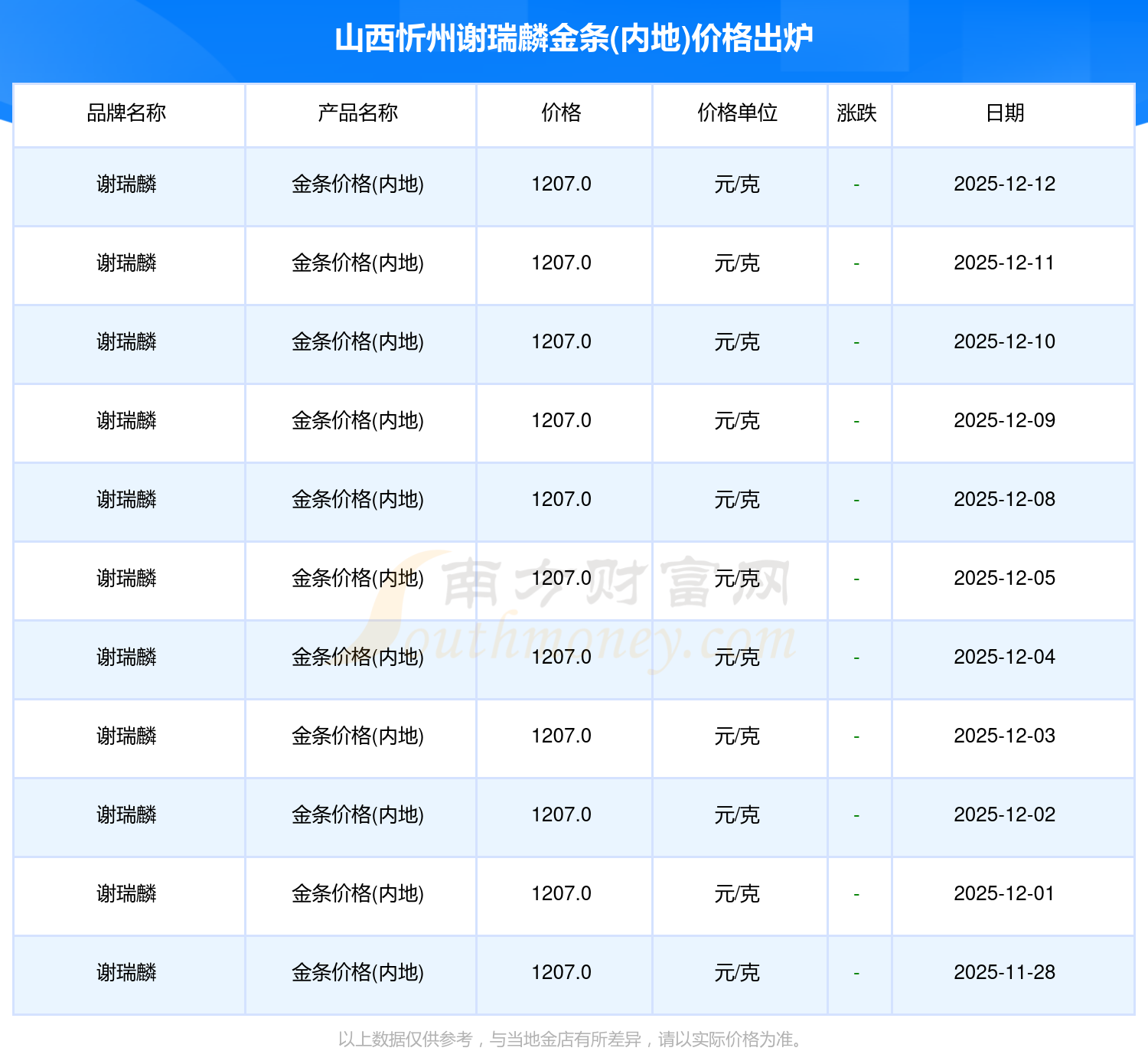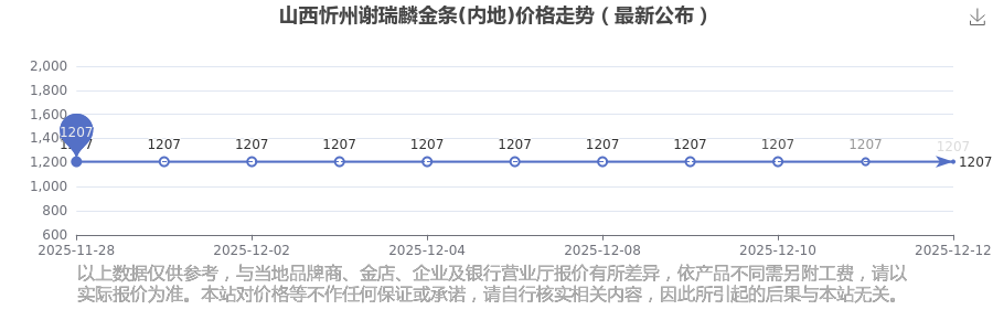 今日(2025年12月13日),山西忻州谢瑞麟金条价格(内地)每克的价值为1207.0元/克。