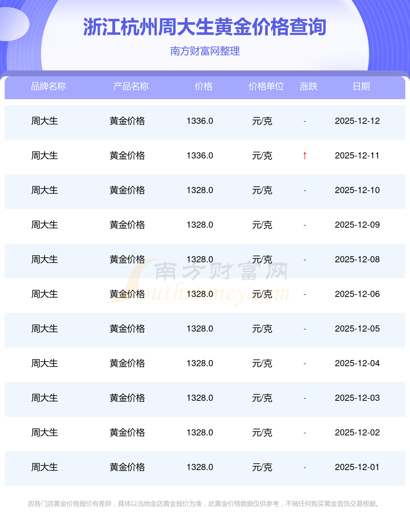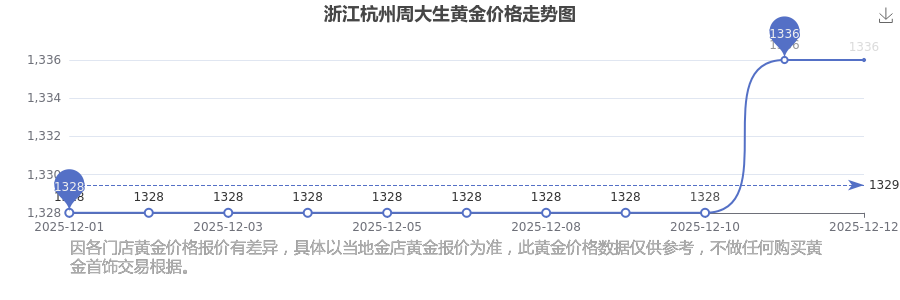 1336.0元/克的黄金价格,是浙江杭州周大生在 2025年12月13日给出的。