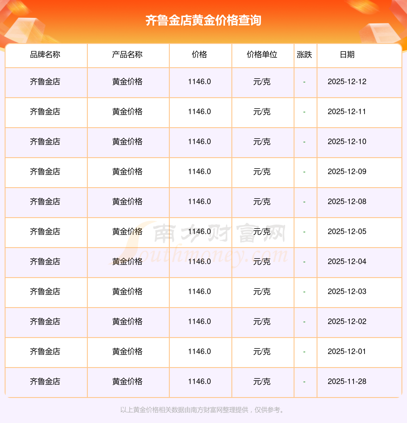 今日齐鲁金店黄金价格最新价格为1146.0元/克。