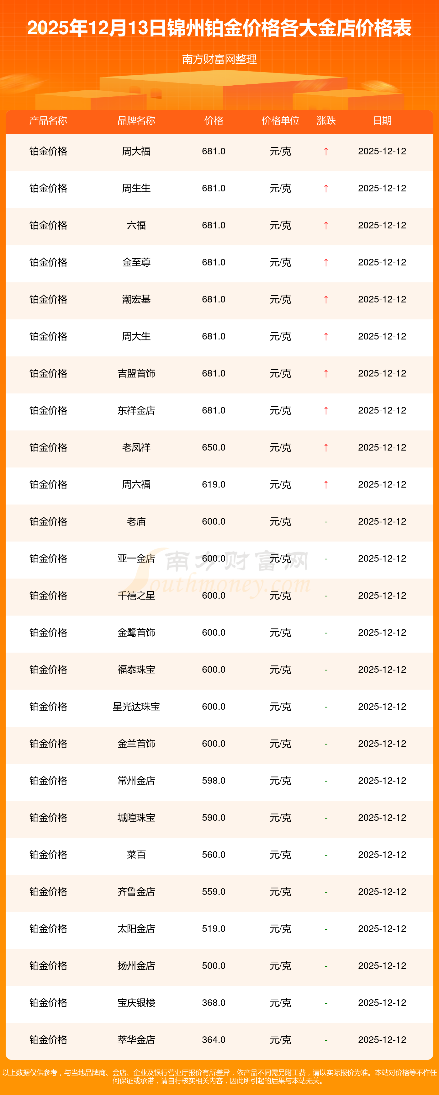 2025年12月13日锦州周大福、周大福、老凤祥、老凤祥、老庙、老庙、周生生、周生生、周大福、周大福、周大福等各大金店品牌铂金价格最新价格行情来了,如下:周大福黄金价格1336.0元/克,周大福铂金价格681.0元/克,老凤祥黄金价格1337.0元/克,老凤祥铂金价格650.0元/克,老庙黄金价格1339.0元/克,老庙铂金价格600.0元/克,周生生黄金价格1338.0元/克,周生生铂金价格681.0元/克,周大福饰品金价(内地)1336.0元/克,周大福黄金饰品(香港)47410.0,周大福铂金价格(香港)19550.0。
