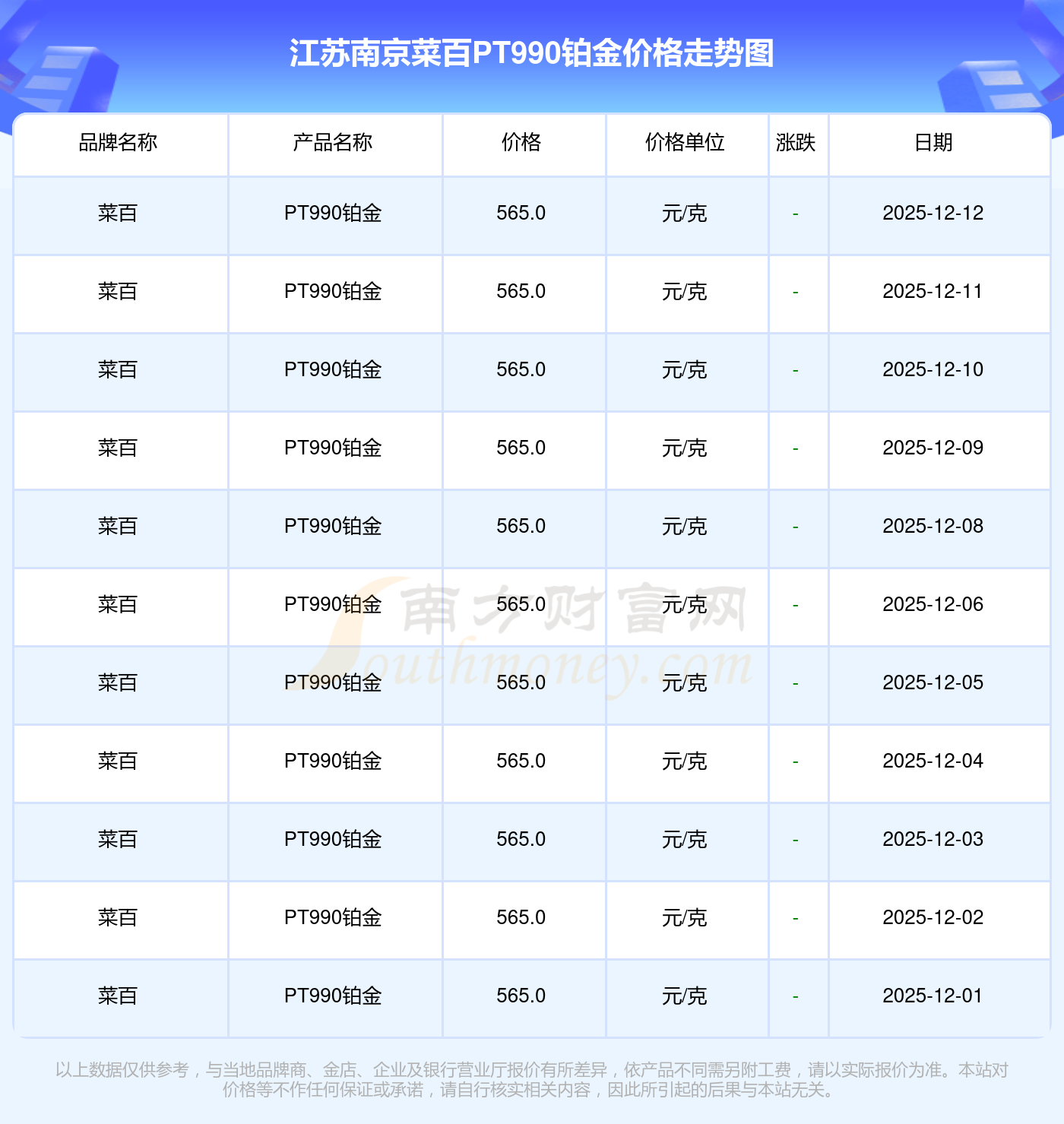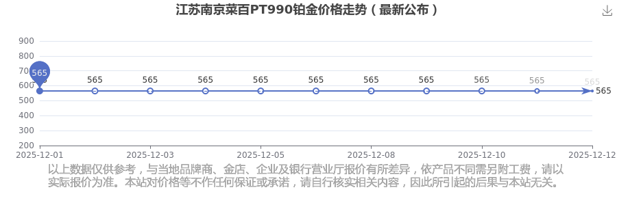 2025年12月13日,江苏南京菜百PT990铂金每克的售卖价位为565.0元/克。