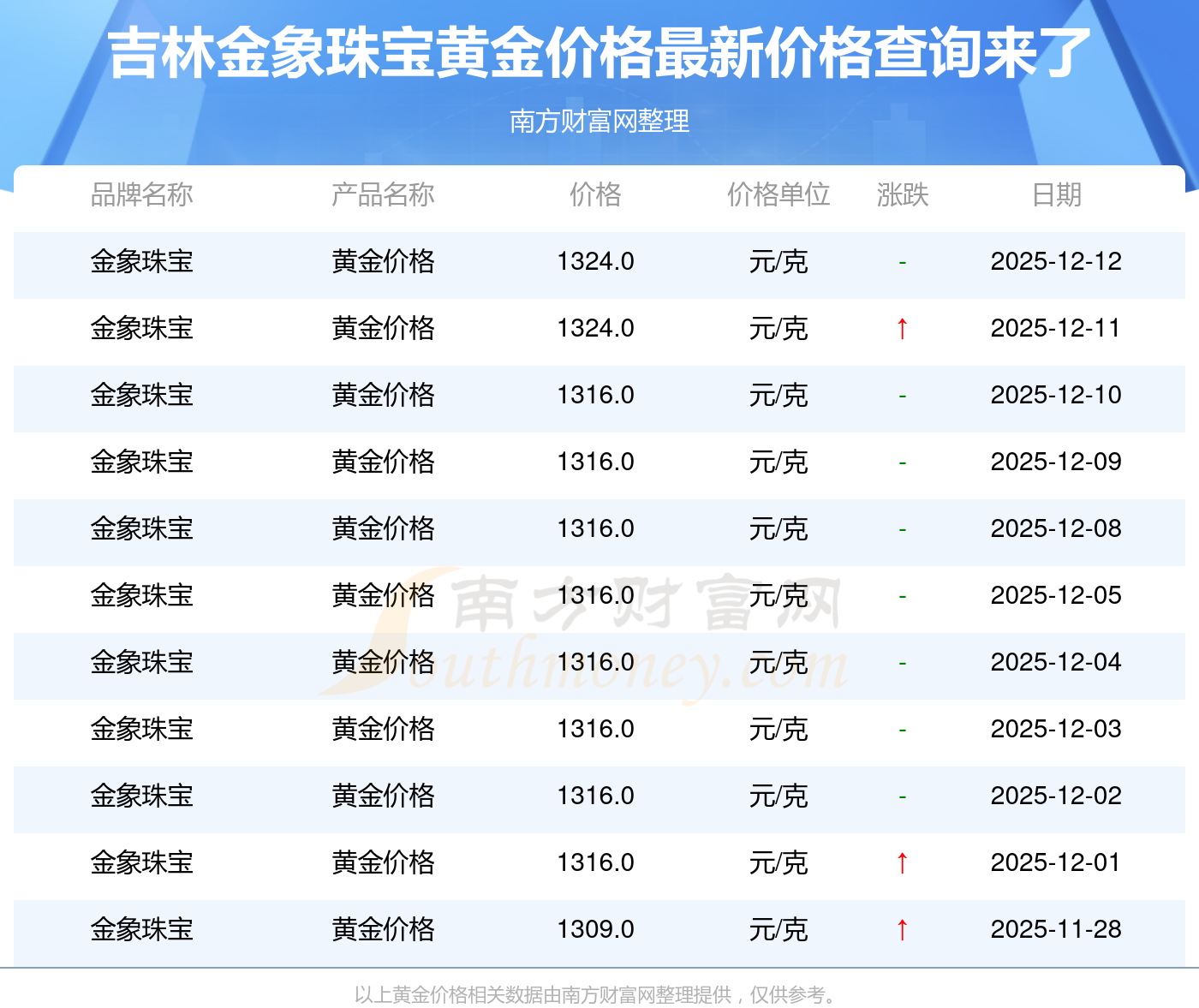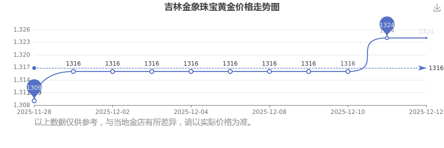于 2025年12月13日,吉林金象珠宝黄金价格的克价为1324.0元/克。