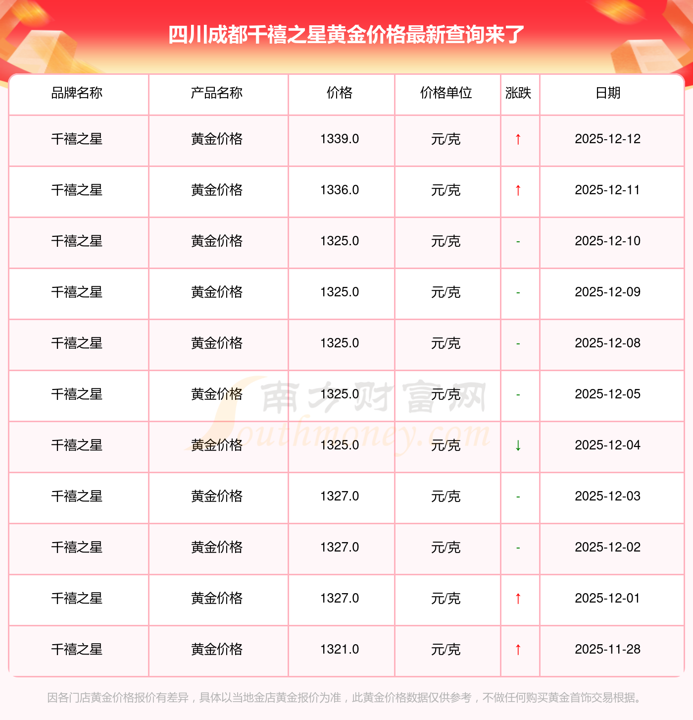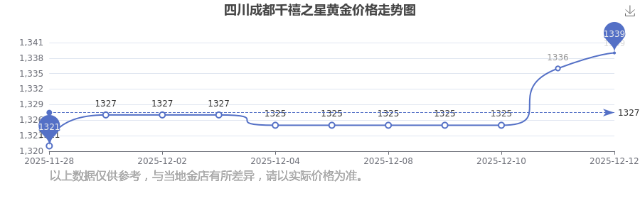 今日(2025年12月13日),四川成都千禧之星黄金价格的价格是1339.0元/克。