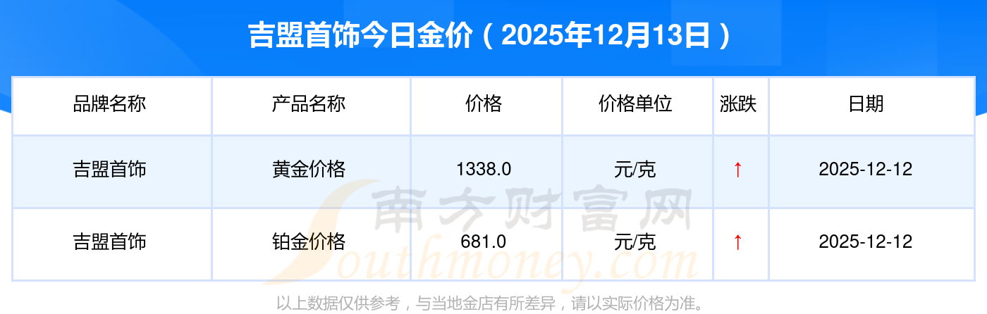 2025年12月13日周大福、周大福、老凤祥、老凤祥、老庙、老庙、周生生、周生生、周大福、周大福、周大福等各大金店品牌黄金价格最新价格如下:周大福黄金价格1336.0元/克,周大福铂金价格681.0元/克,老凤祥黄金价格1337.0元/克,老凤祥铂金价格650.0元/克,老庙黄金价格1339.0元/克,老庙铂金价格600.0元/克,周生生黄金价格1338.0元/克,周生生铂金价格681.0元/克,周大福饰品金价(内地)1336.0元/克,周大福黄金饰品(香港)47410.0,周大福铂金价格(香港)19550.0。
