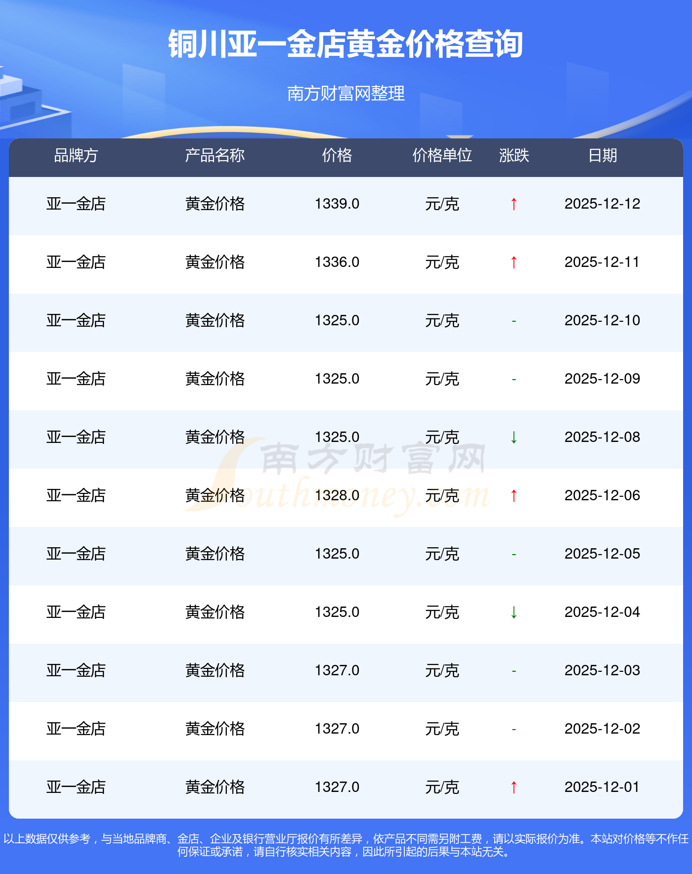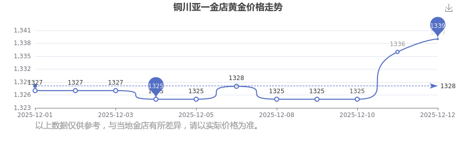 2025年12月13日这一天,铜川亚一金店的黄金价格以 1339.0元/克的价格售卖。