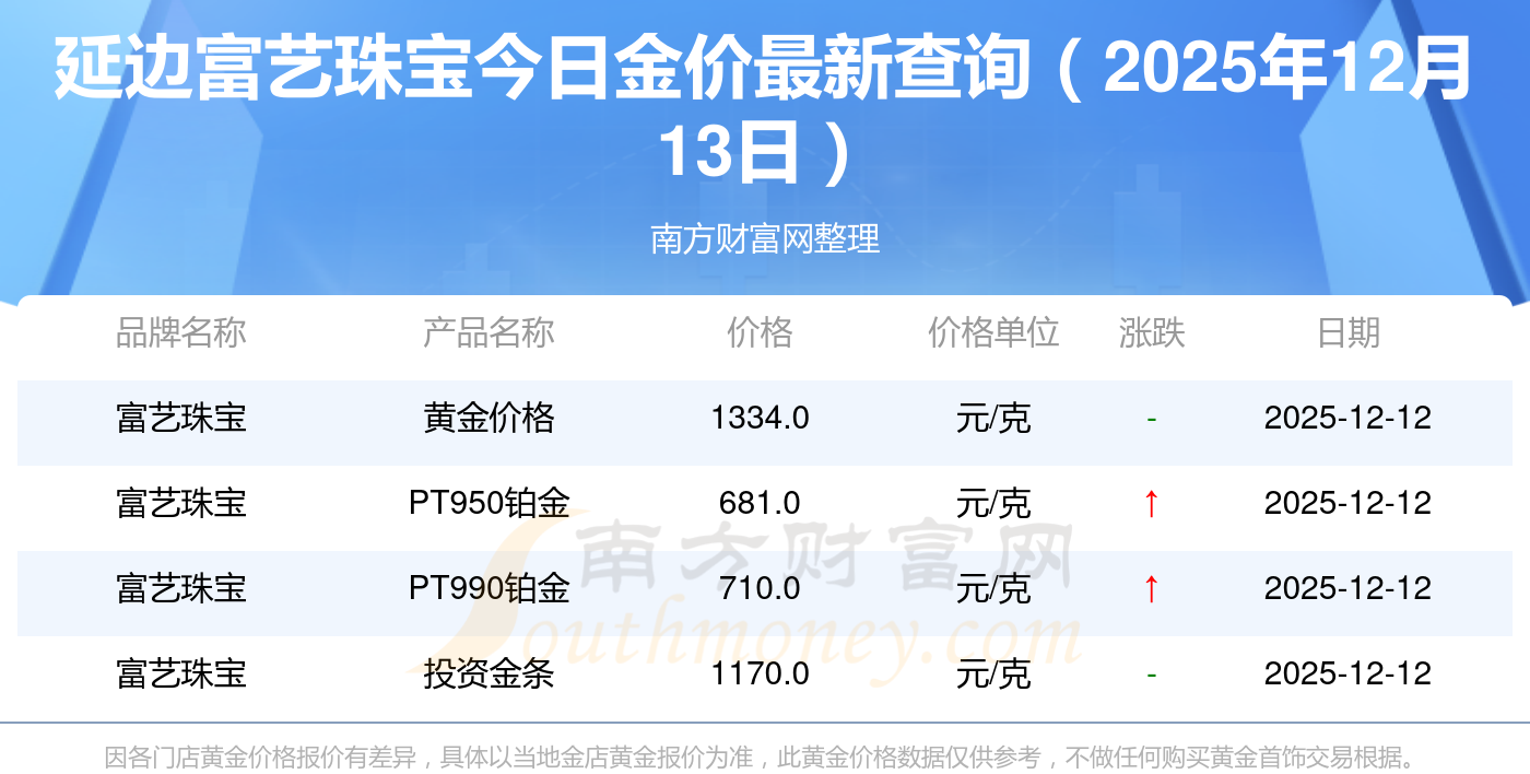 2025年12月13日延边富艺珠宝黄金的单价,一克为多少?黄金价格1336.0元/克,铂金价格681.0元/克,黄金价格1337.0元/克,铂金价格650.0元/克,黄金价格1339.0元/克,铂金价格600.0元/克,黄金价格1338.0元/克,铂金价格681.0元/克,饰品金价(内地)1336.0元/克,黄金饰品(香港)47410.0,铂金价格(香港)19550.0。