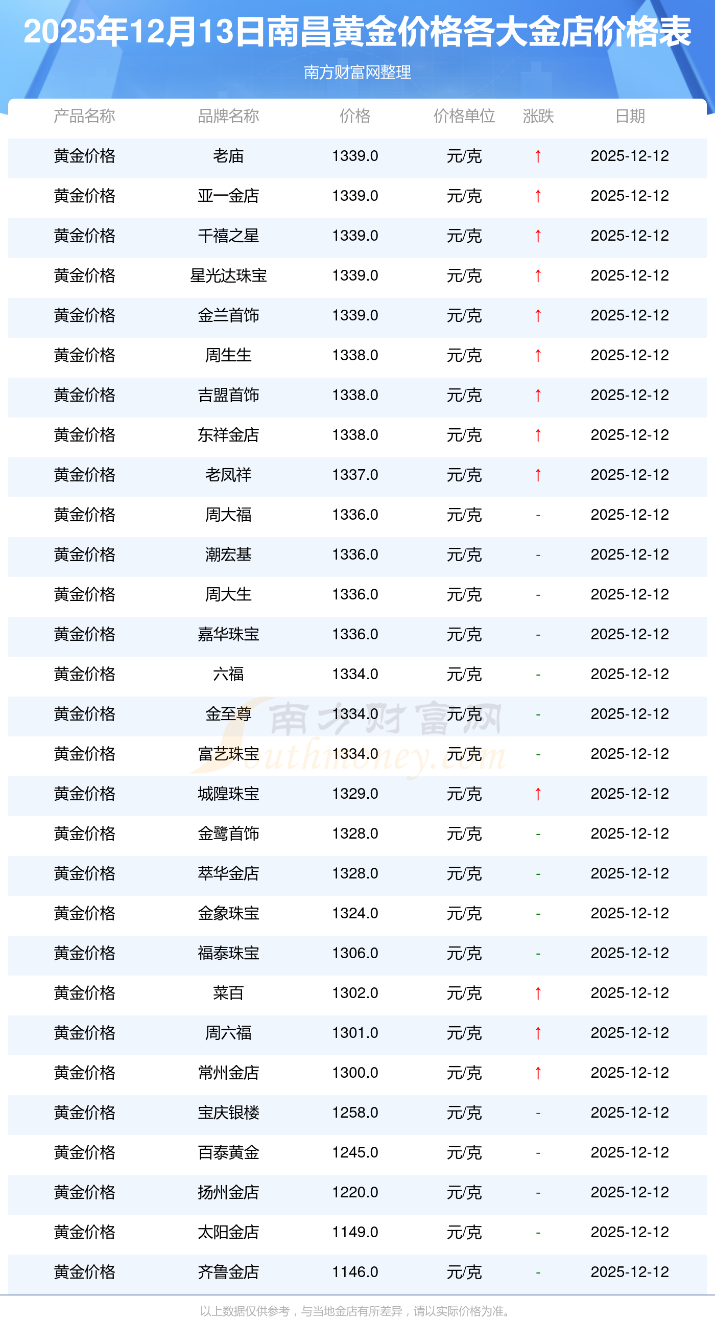 2025年12月13日南昌周大福、周大福、老凤祥、老凤祥、老庙、老庙、周生生、周生生、周大福、周大福、周大福等各大金店品牌黄金价格最新价格行情来了,如下:周大福黄金价格1336.0元/克,周大福铂金价格681.0元/克,老凤祥黄金价格1337.0元/克,老凤祥铂金价格650.0元/克,老庙黄金价格1339.0元/克,老庙铂金价格600.0元/克,周生生黄金价格1338.0元/克,周生生铂金价格681.0元/克,周大福饰品金价(内地)1336.0元/克,周大福黄金饰品(香港)47410.0,周大福铂金价格(香港)19550.0。