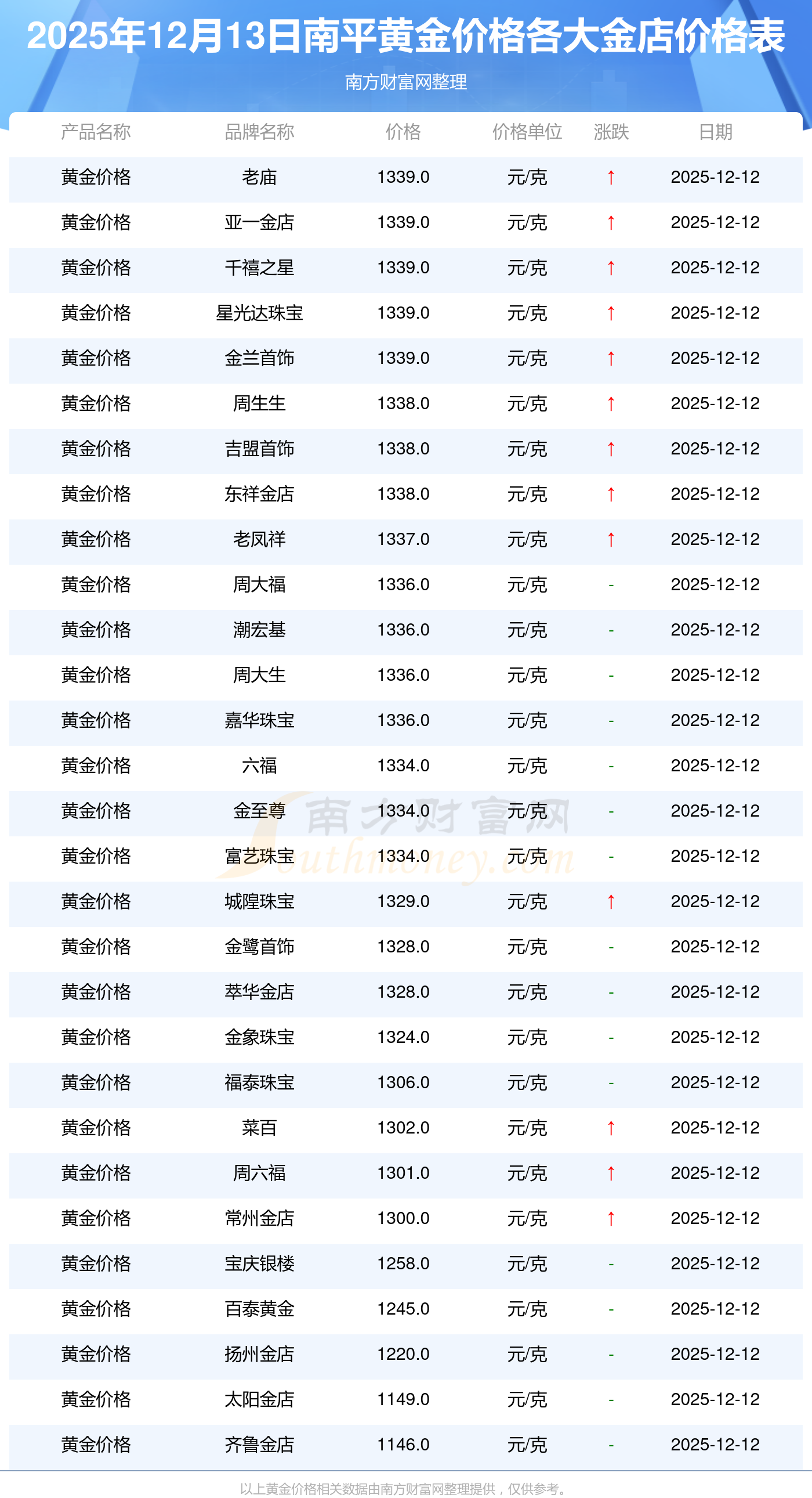 南平各大金店黄金价格多少钱一克?黄金价格今日金价查询表(2025年12月13日)