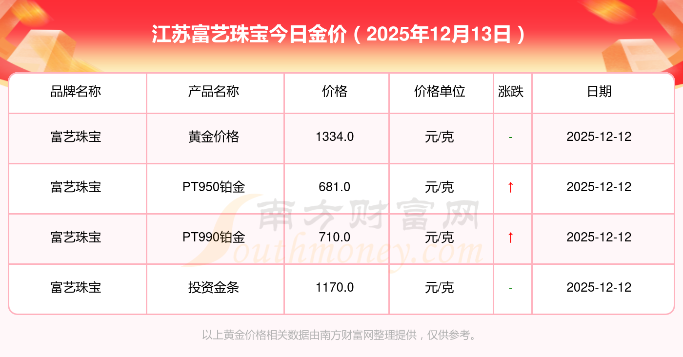 今天黄金价格行情怎样?此刻每克黄金售价多少?2025年12月13日江苏富艺珠宝今日价格:黄金价格1336.0元/克,铂金价格681.0元/克,黄金价格1337.0元/克,铂金价格650.0元/克,黄金价格1339.0元/克,铂金价格600.0元/克,黄金价格1338.0元/克,铂金价格681.0元/克,饰品金价(内地)1336.0元/克,黄金饰品(香港)47410.0,铂金价格(香港)19550.0。