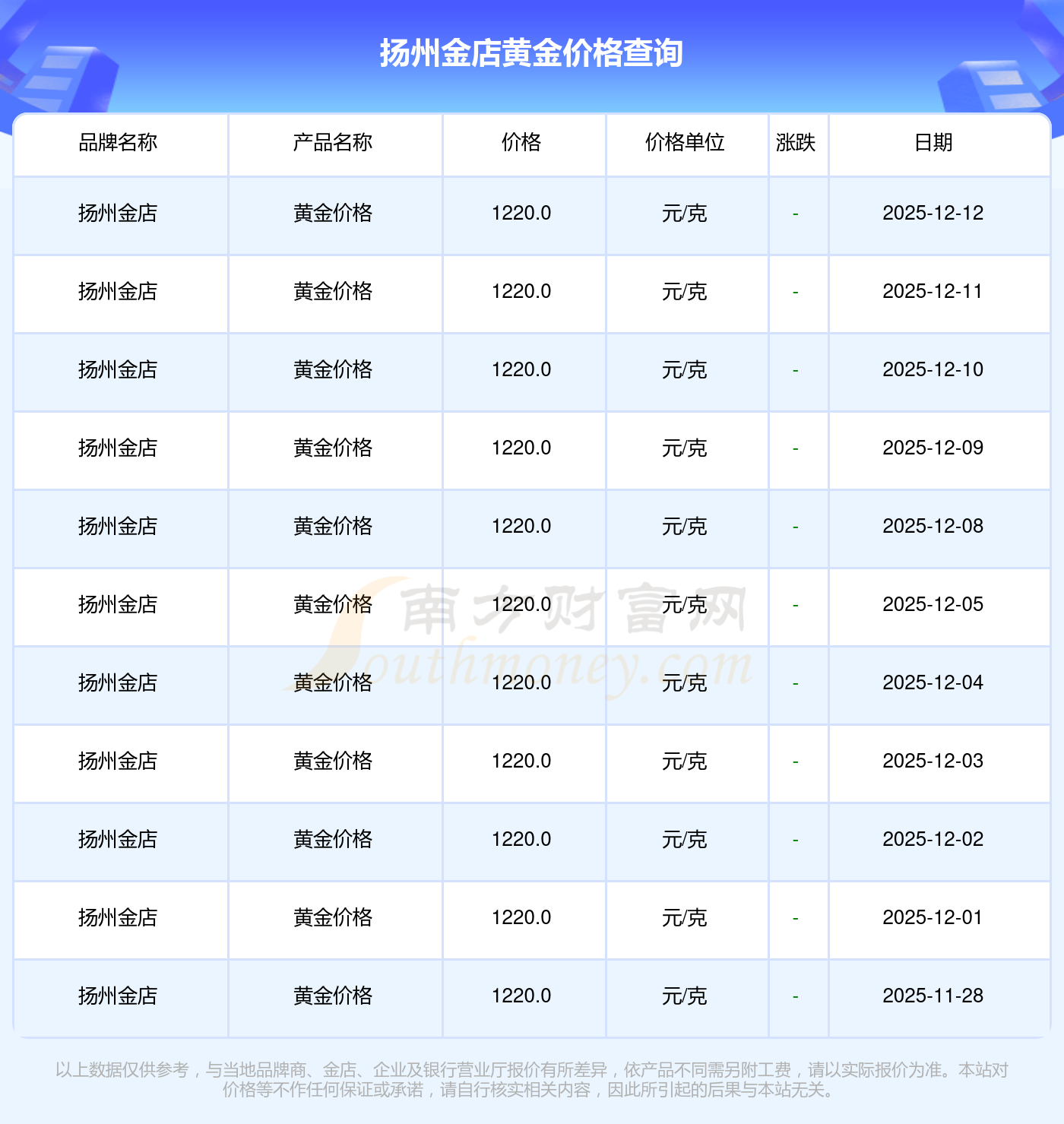 扬州金店今日黄金价格的最新标价为1220.0元/克。