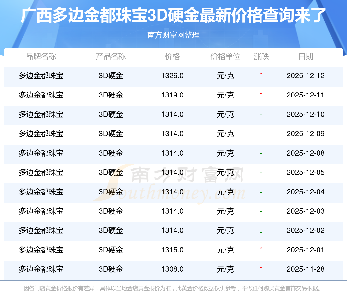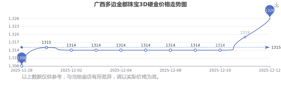 今日(2025年12月13日)广西多边金都珠宝3D硬金价格:1326.0元/克。