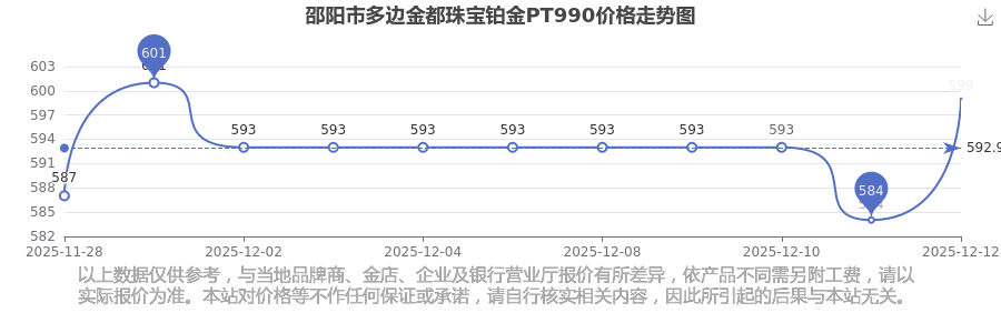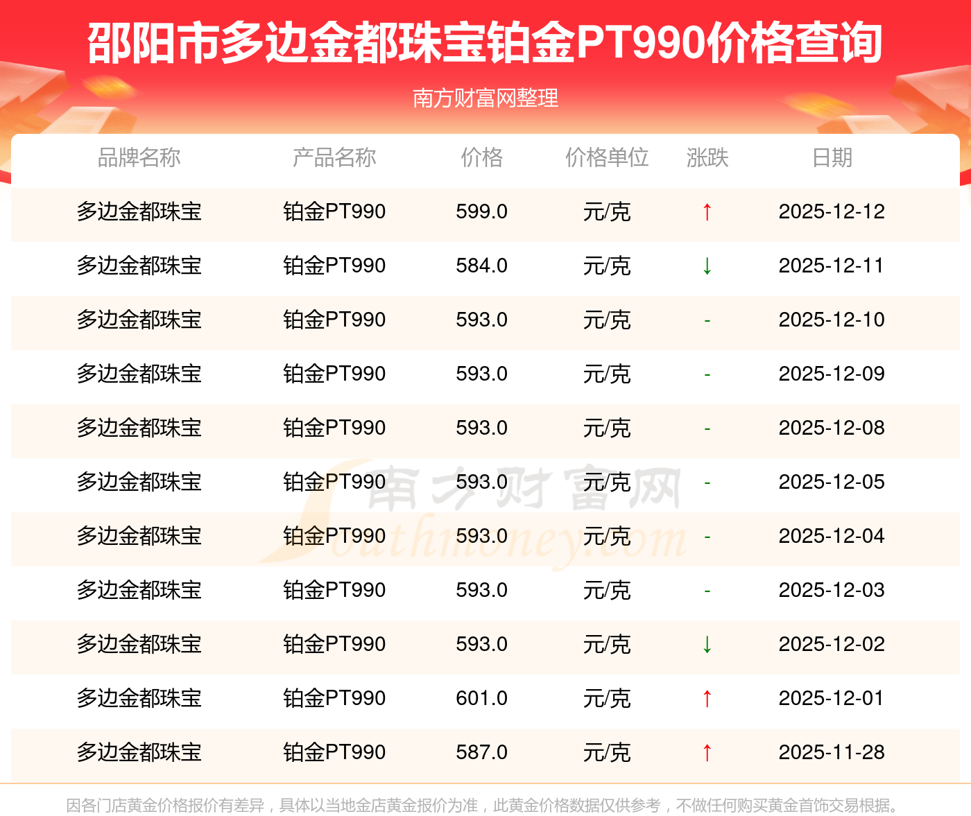 2025年12月13日,邵阳市多边金都珠宝铂金PT990每克的售卖价位为599.0元/克。