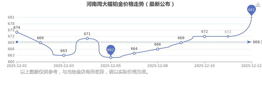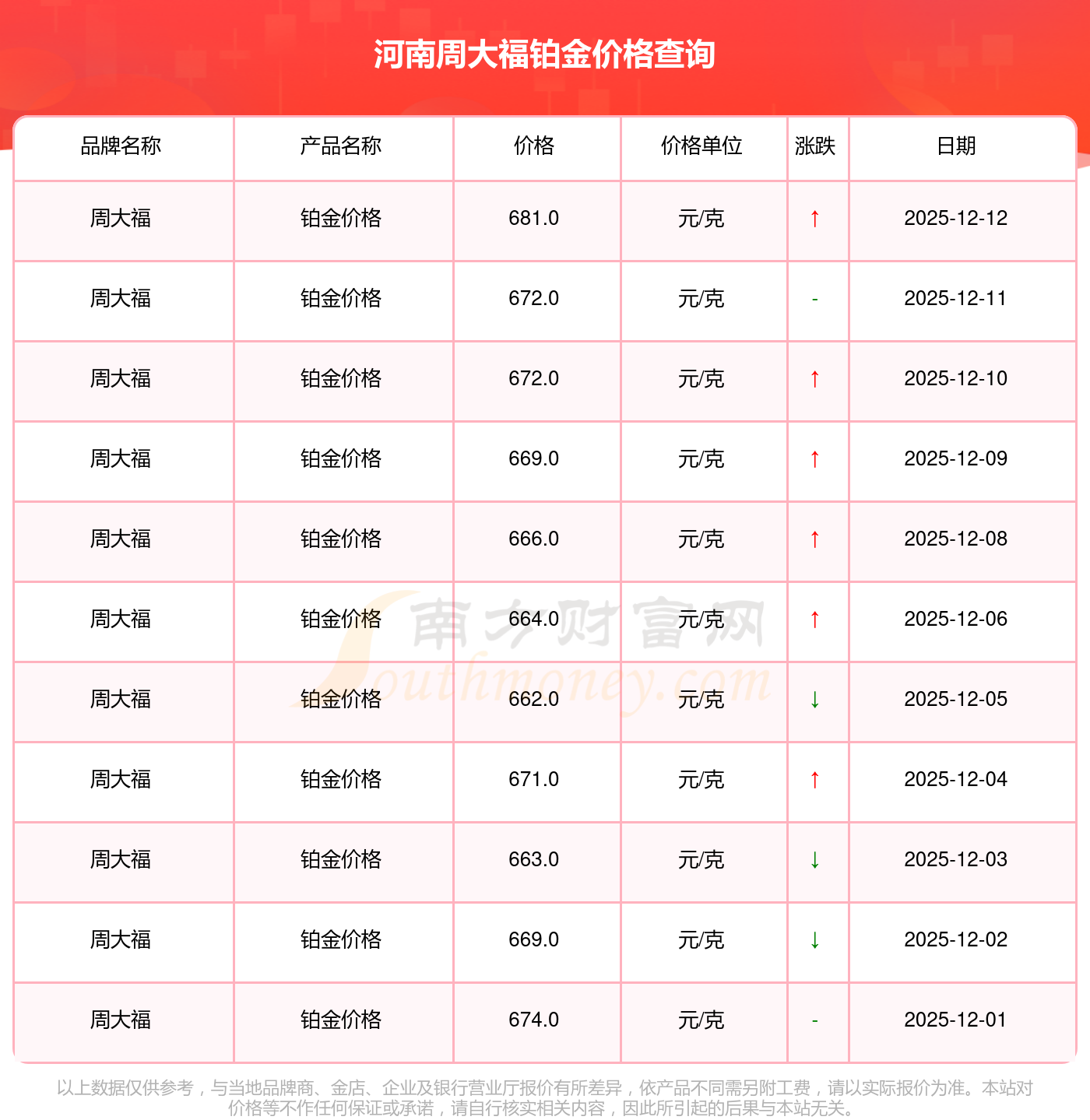 今日(2025年12月13日)河南周大福铂金价格最新价格为681.0元/克。