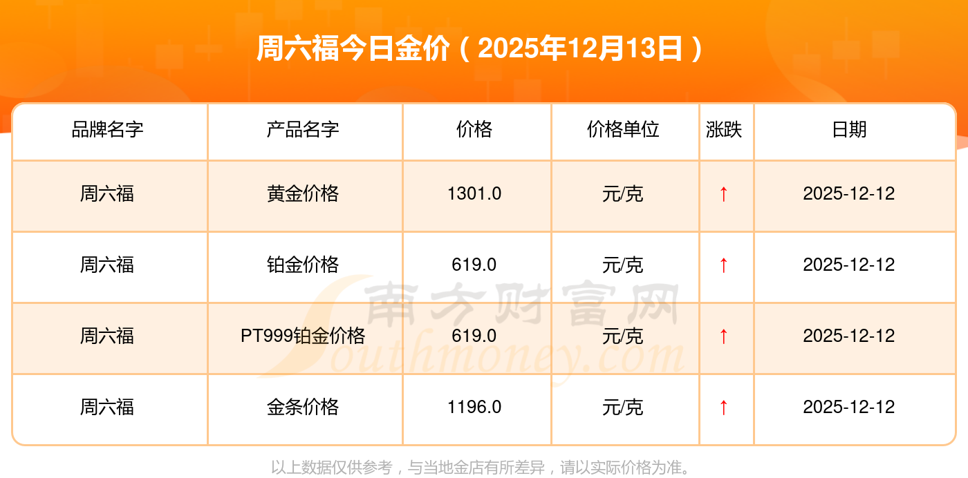 2025年12月13日周大福、周大福、老凤祥、老凤祥、老庙、老庙、周生生、周生生、周大福、周大福、周大福等各大金店品牌黄金价格最新价格如下:周大福黄金价格1336.0元/克,周大福铂金价格681.0元/克,老凤祥黄金价格1337.0元/克,老凤祥铂金价格650.0元/克,老庙黄金价格1339.0元/克,老庙铂金价格600.0元/克,周生生黄金价格1338.0元/克,周生生铂金价格681.0元/克,周大福饰品金价(内地)1336.0元/克,周大福黄金饰品(香港)47410.0,周大福铂金价格(香港)19550.0。