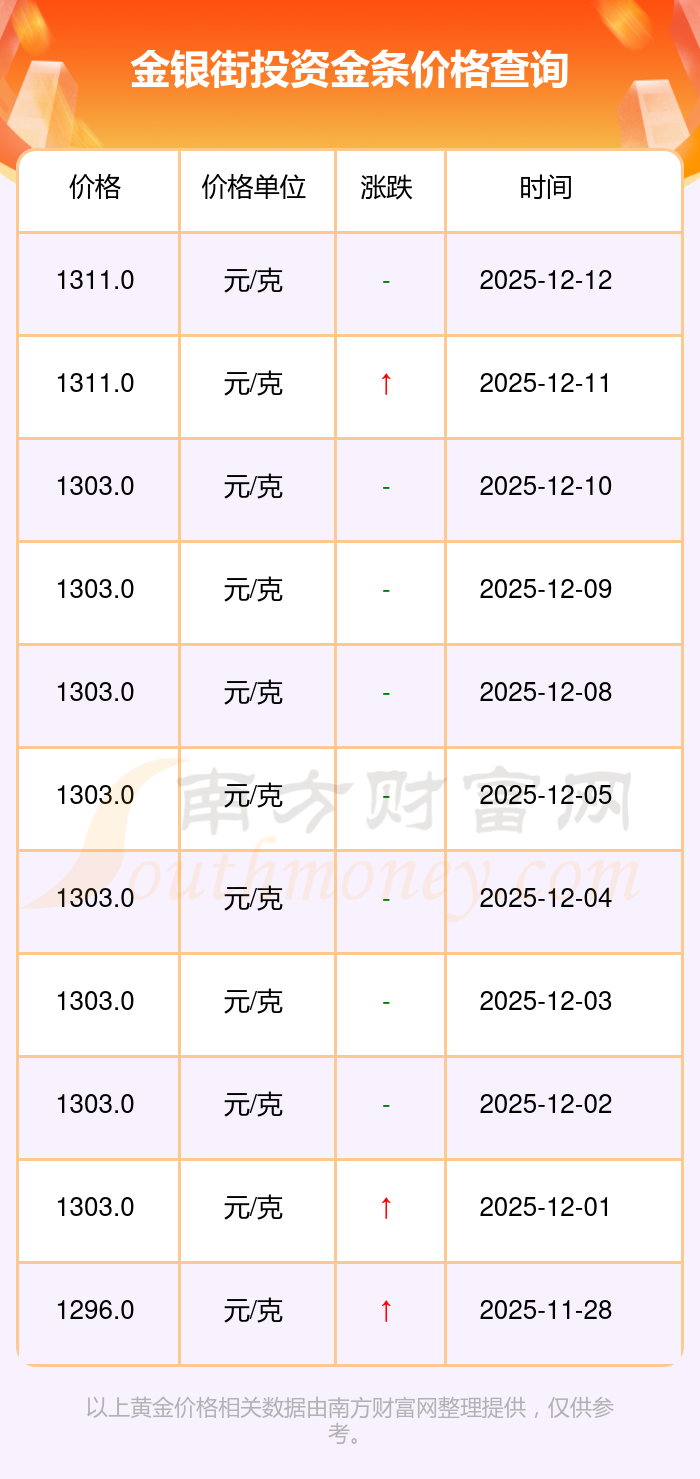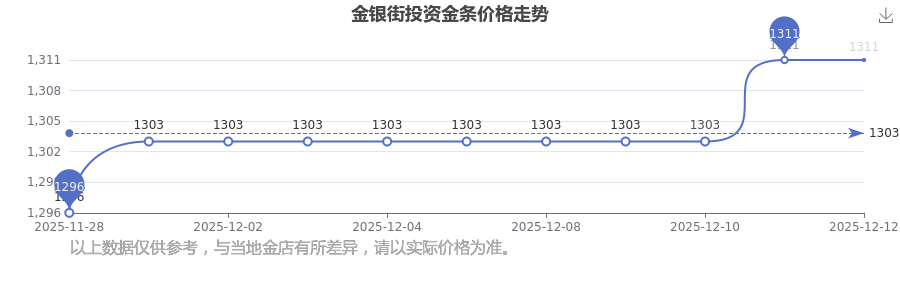 今日金银街 投资金条最新的市场标价为1311.0元/克。