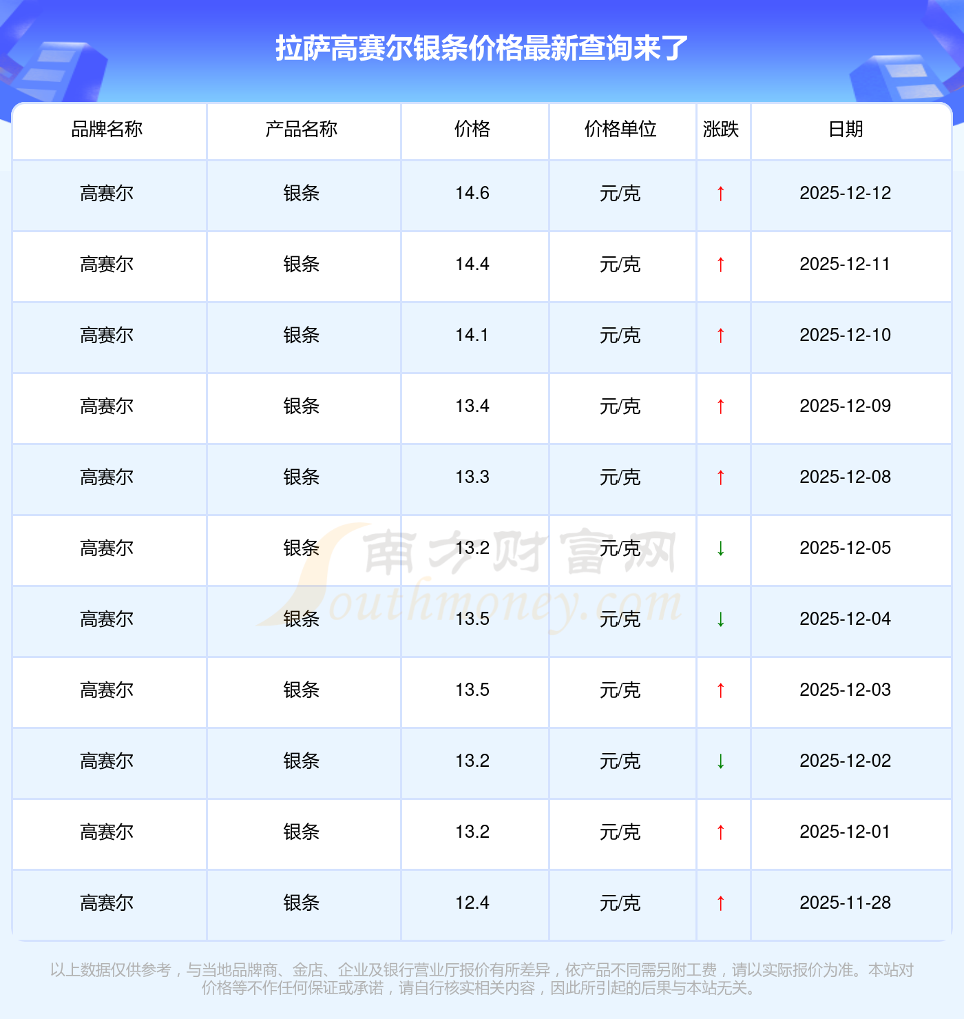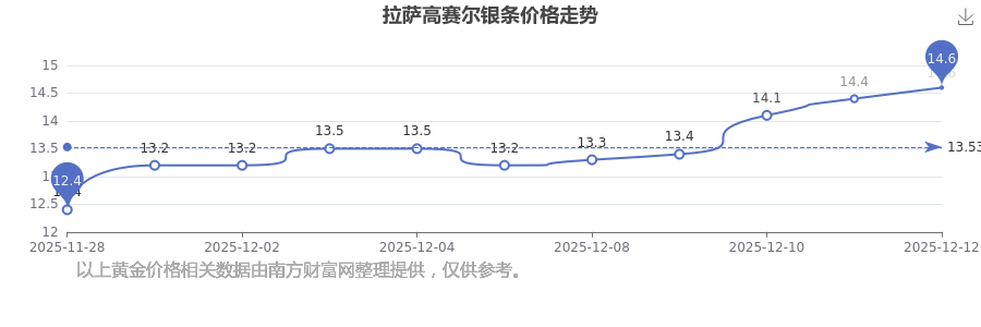 于 2025年12月13日,拉萨高赛尔银条的克价为14.6元/克。