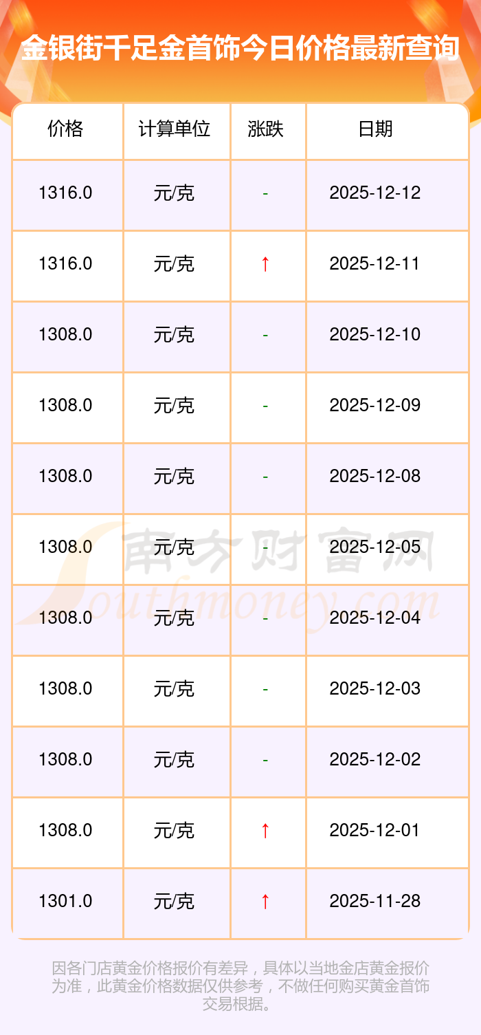 今日(2025年12月13日),金银街千足金首饰价格:1316.0元/克。