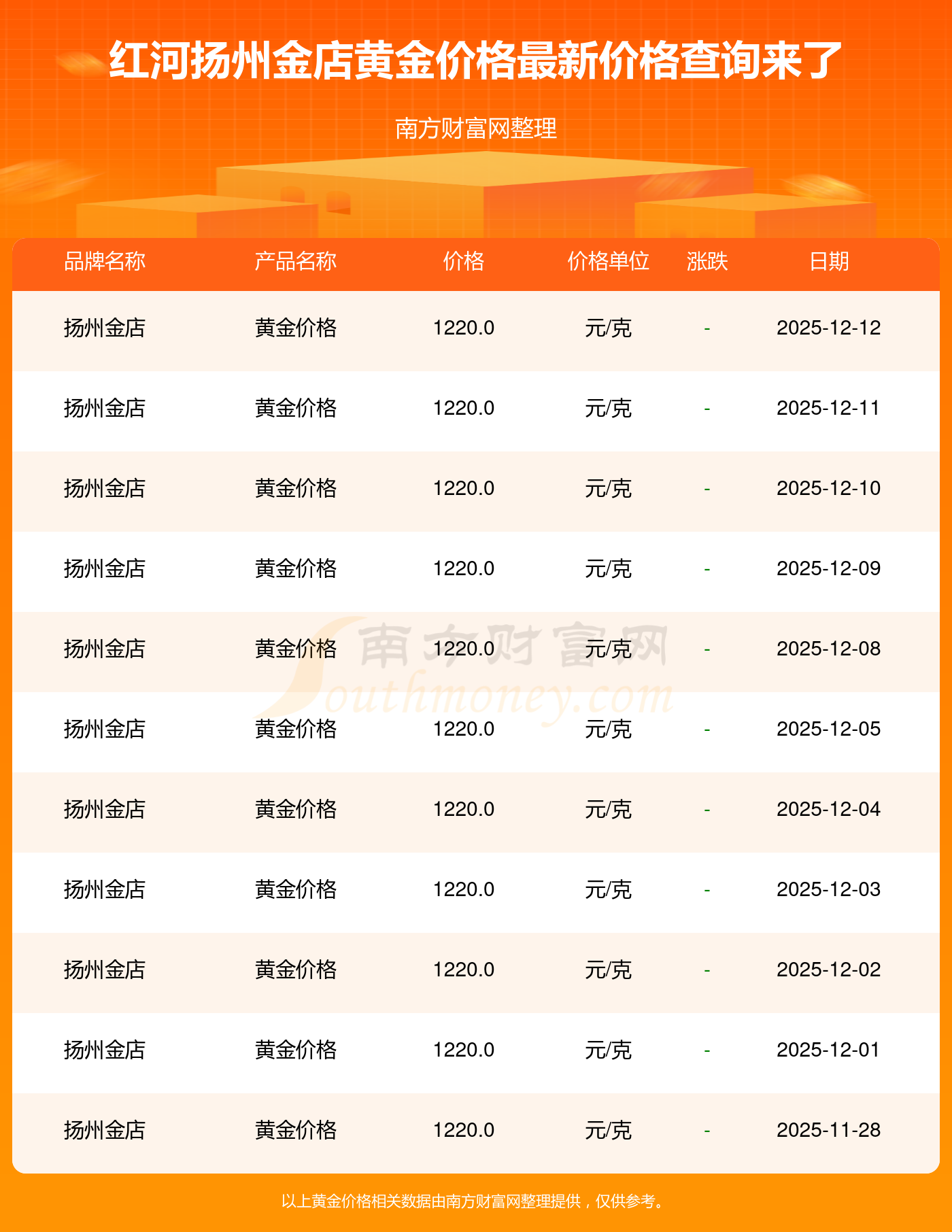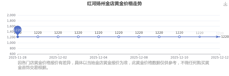 今日(2025年12月13日),红河扬州金店黄金价格每克的价值为1220.0元/克。