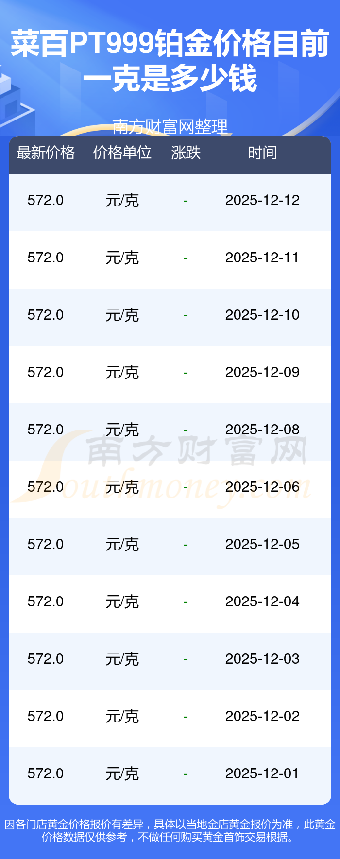 2025年12月13日菜百PT999铂金价格为572.0元/克。