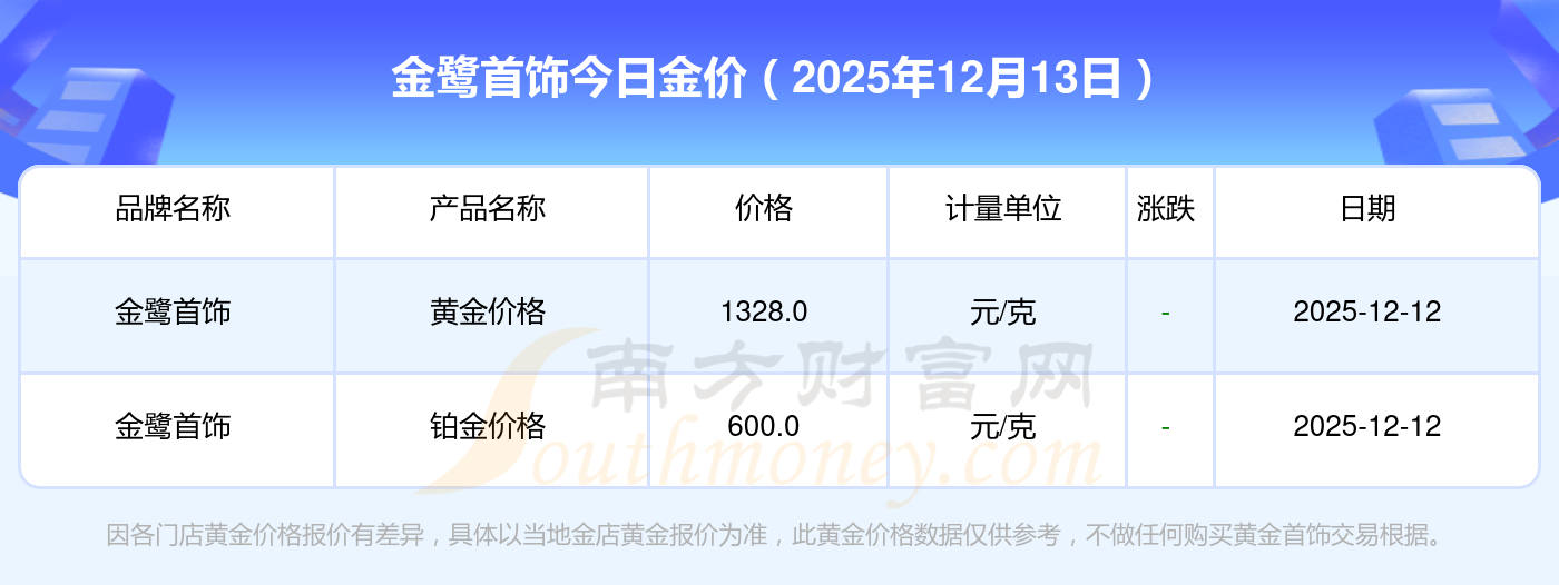 2025年12月13日金鹭首饰金价查询:黄金价格1336.0元/克,铂金价格681.0元/克,黄金价格1337.0元/克,铂金价格650.0元/克,黄金价格1339.0元/克,铂金价格600.0元/克,黄金价格1338.0元/克,铂金价格681.0元/克,饰品金价(内地)1336.0元/克,黄金饰品(香港)47410.0,铂金价格(香港)19550.0。