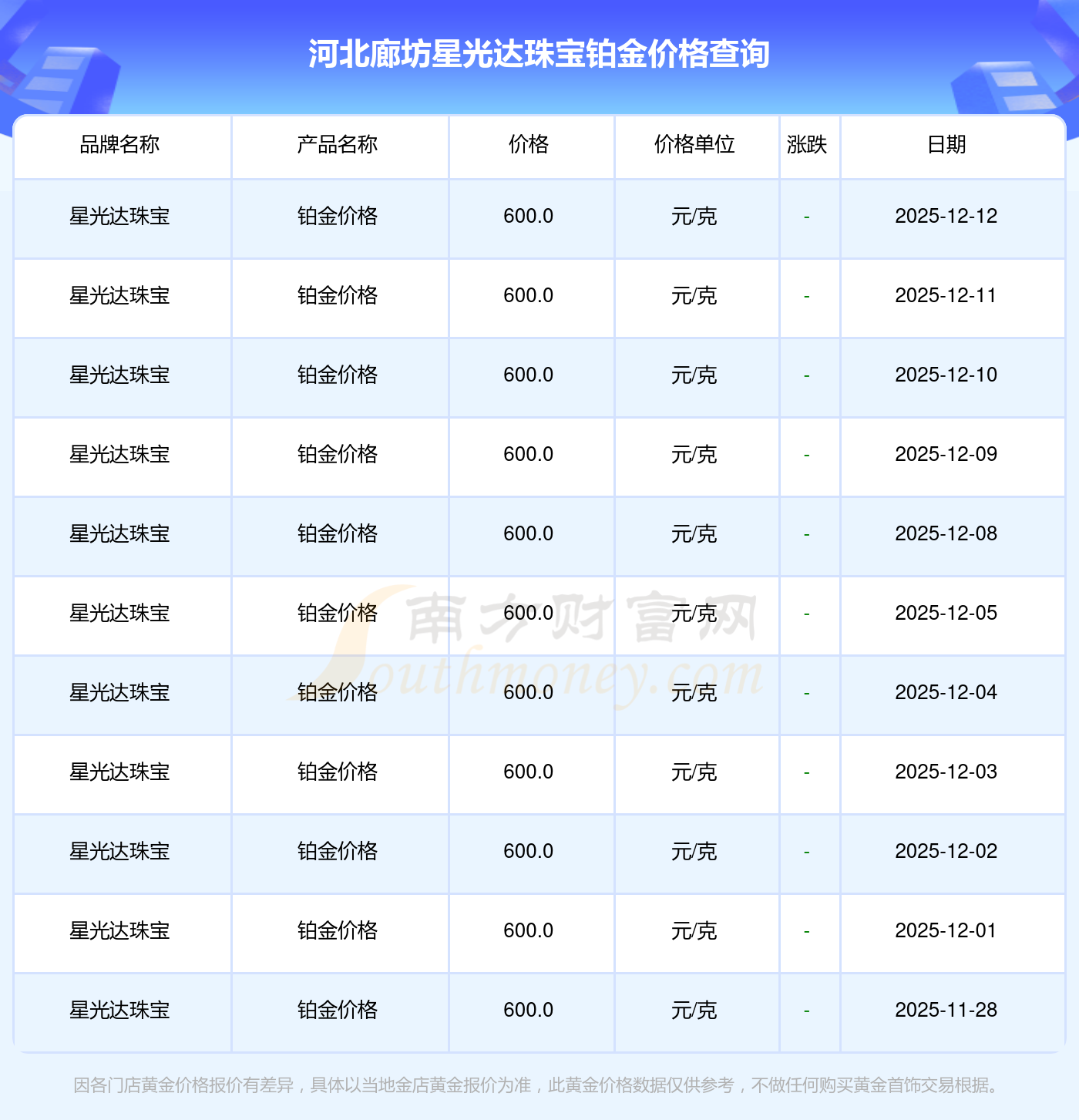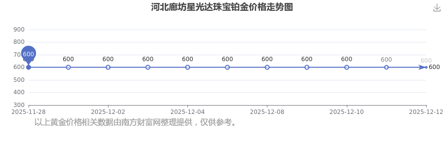 今日(2025年12月13日),河北廊坊星光达珠宝铂金价格的价格是600.0元/克。