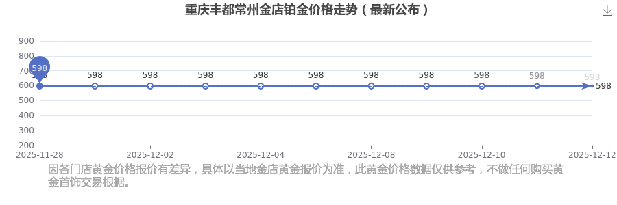 今日(2025年12月13日),重庆丰都常州金店铂金价格的价格是598.0元/克。