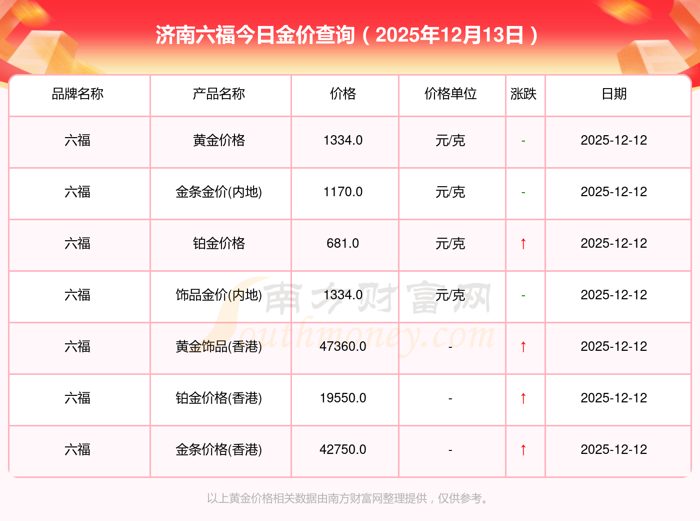 2025年12月13日济南六福黄金按克计价,现在多少钱一克?黄金价格1336.0元/克,铂金价格681.0元/克,黄金价格1337.0元/克,铂金价格650.0元/克,黄金价格1339.0元/克,铂金价格600.0元/克,黄金价格1338.0元/克,铂金价格681.0元/克,饰品金价(内地)1336.0元/克,黄金饰品(香港)47410.0,铂金价格(香港)19550.0。