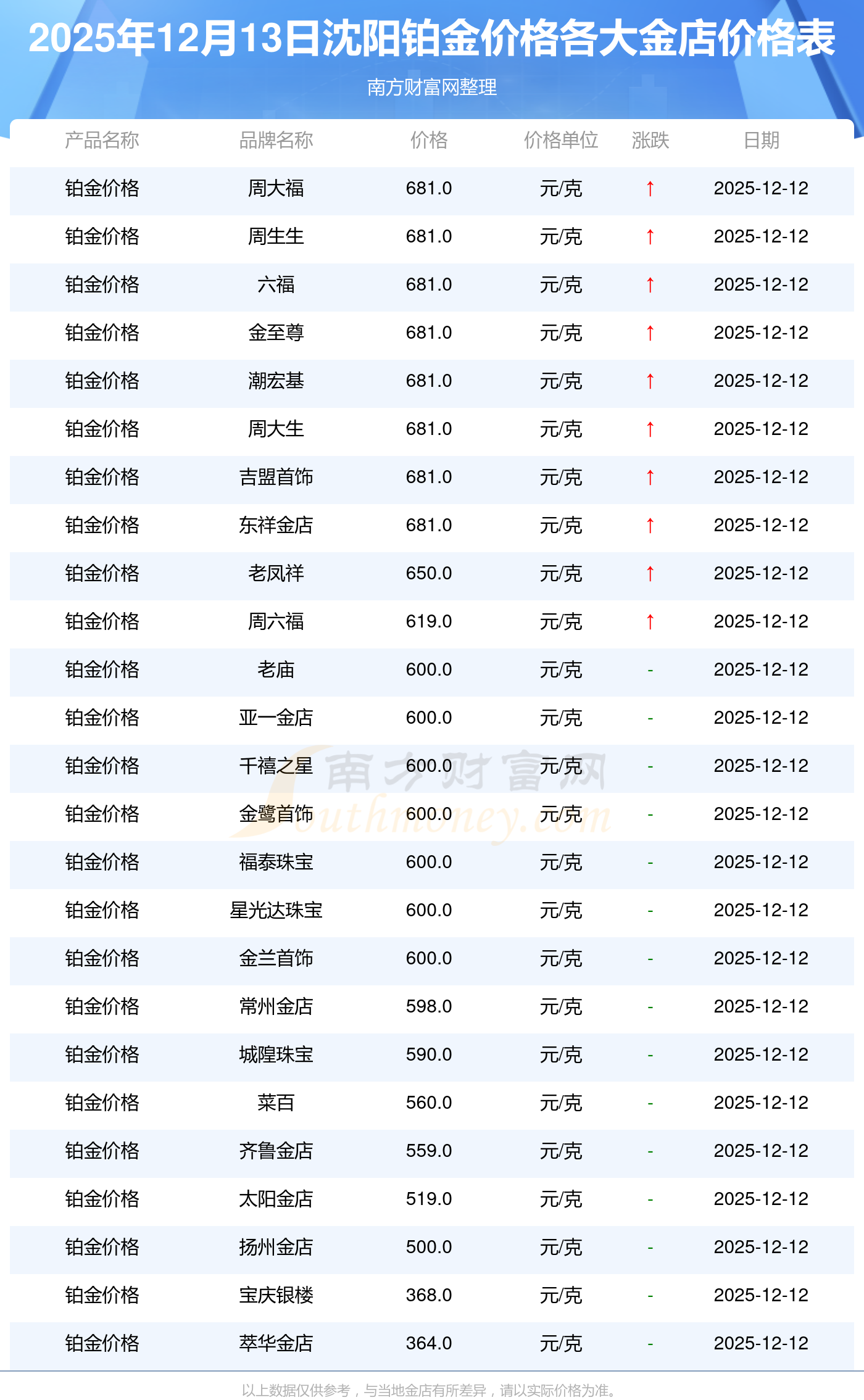2025年12月13日沈阳各大金店铂金价格最新价格:周大福1336.0元/克,周大福681.0元/克,老凤祥1337.0元/克,老凤祥650.0元/克,老庙1339.0元/克,老庙600.0元/克,周生生1338.0元/克,周生生681.0元/克,周大福1336.0元/克,周大福47410.0,周大福19550.0。