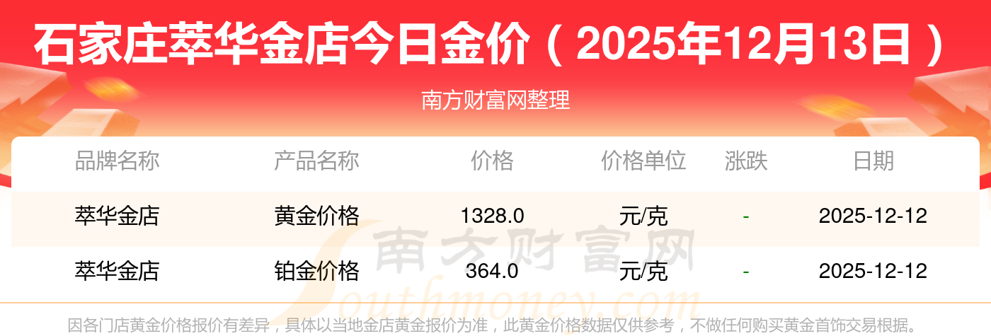 2025年12月13日石家庄萃华金店每克黄金的市场价格是多少:黄金价格1336.0元/克,铂金价格681.0元/克,黄金价格1337.0元/克,铂金价格650.0元/克,黄金价格1339.0元/克,铂金价格600.0元/克,黄金价格1338.0元/克,铂金价格681.0元/克,饰品金价(内地)1336.0元/克,黄金饰品(香港)47410.0,铂金价格(香港)19550.0。